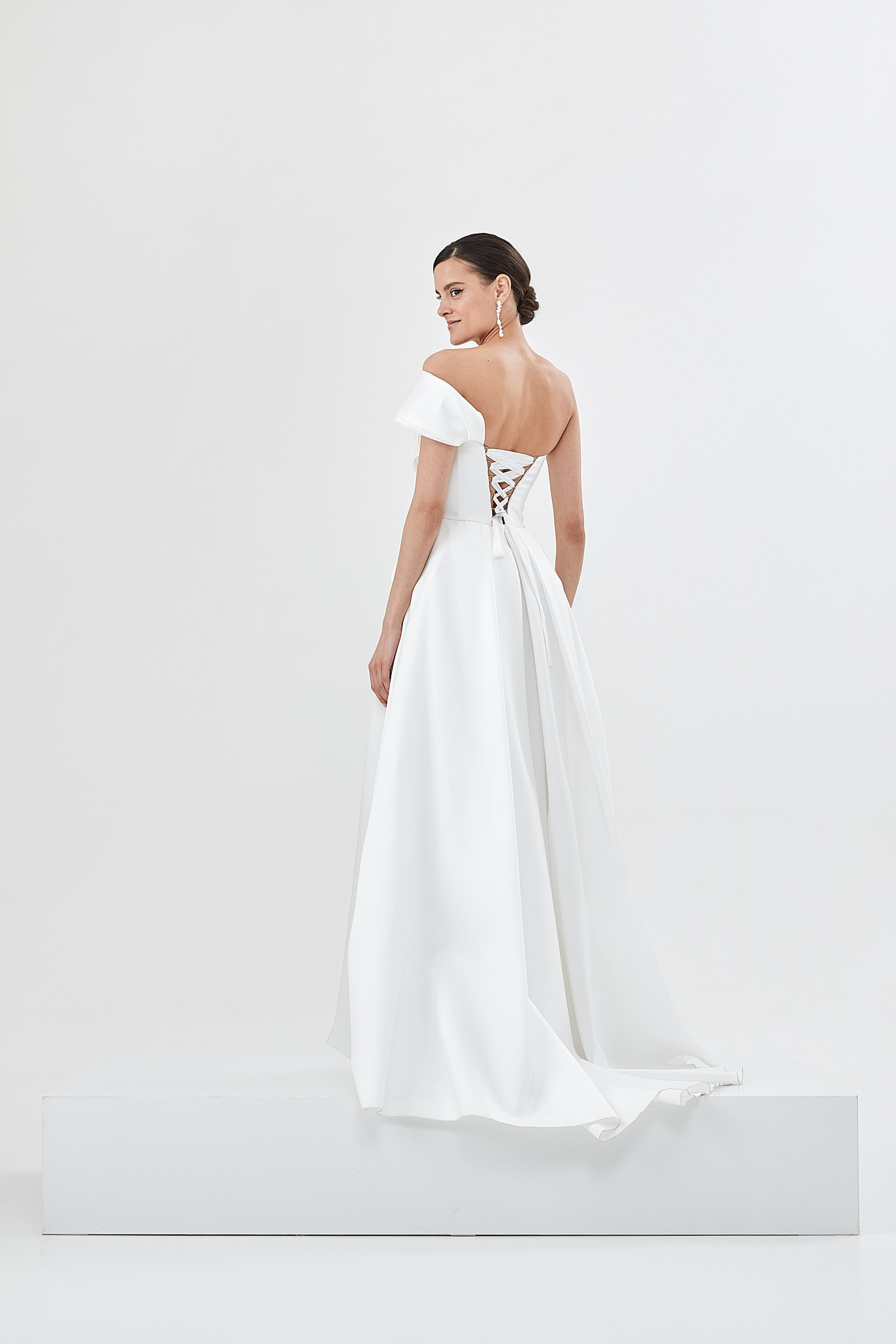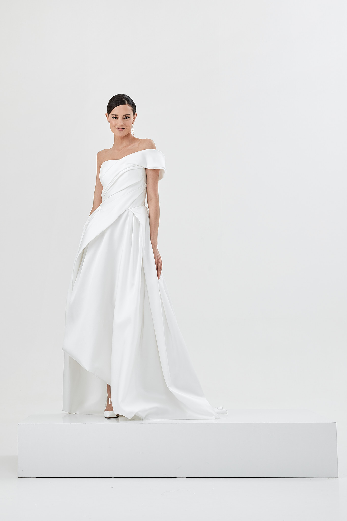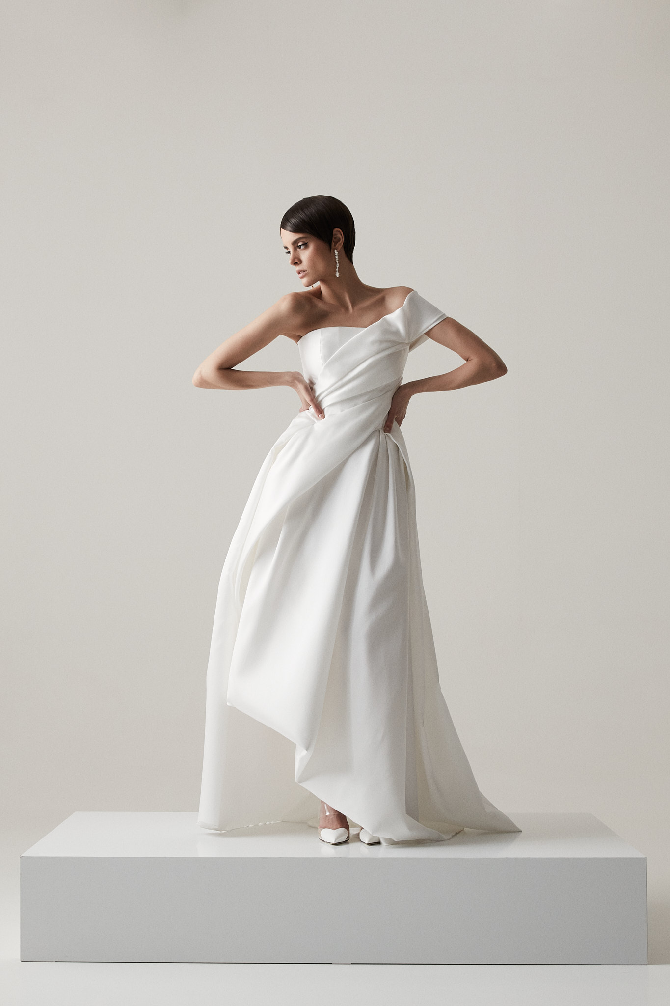 Asymmetric drapes define a complex bridal look with an architectural feel. Silk taffeta embraces the silhouette, sensually revealing the ankle, accentuating the waistline and subtly falling off shoulder. Thea is a wedding dress designed for a modern, sophisticate bride.