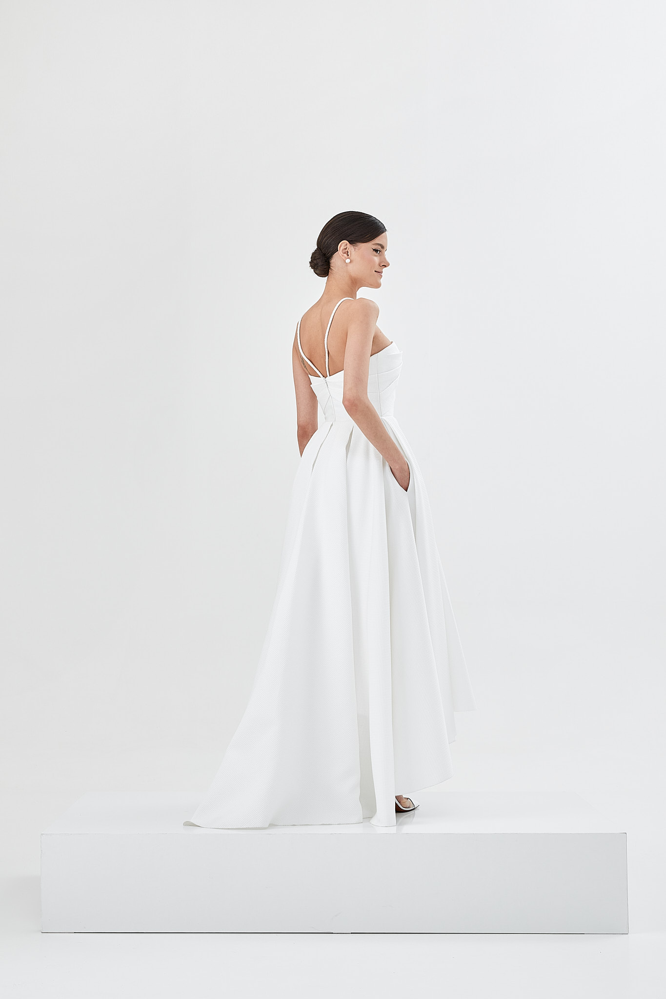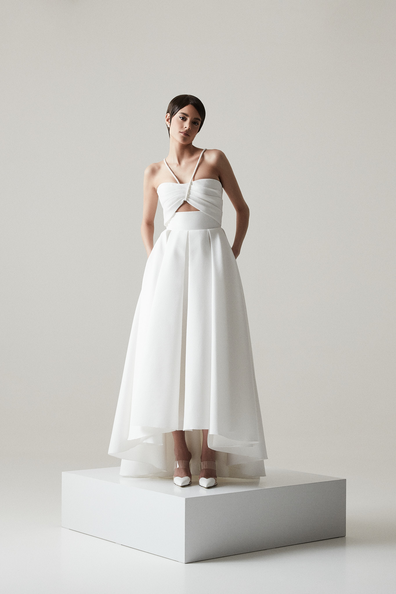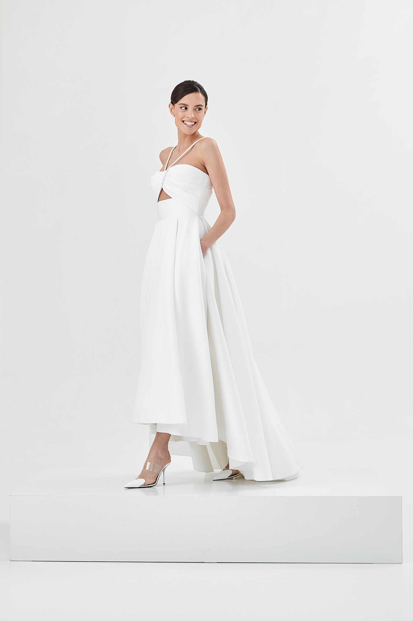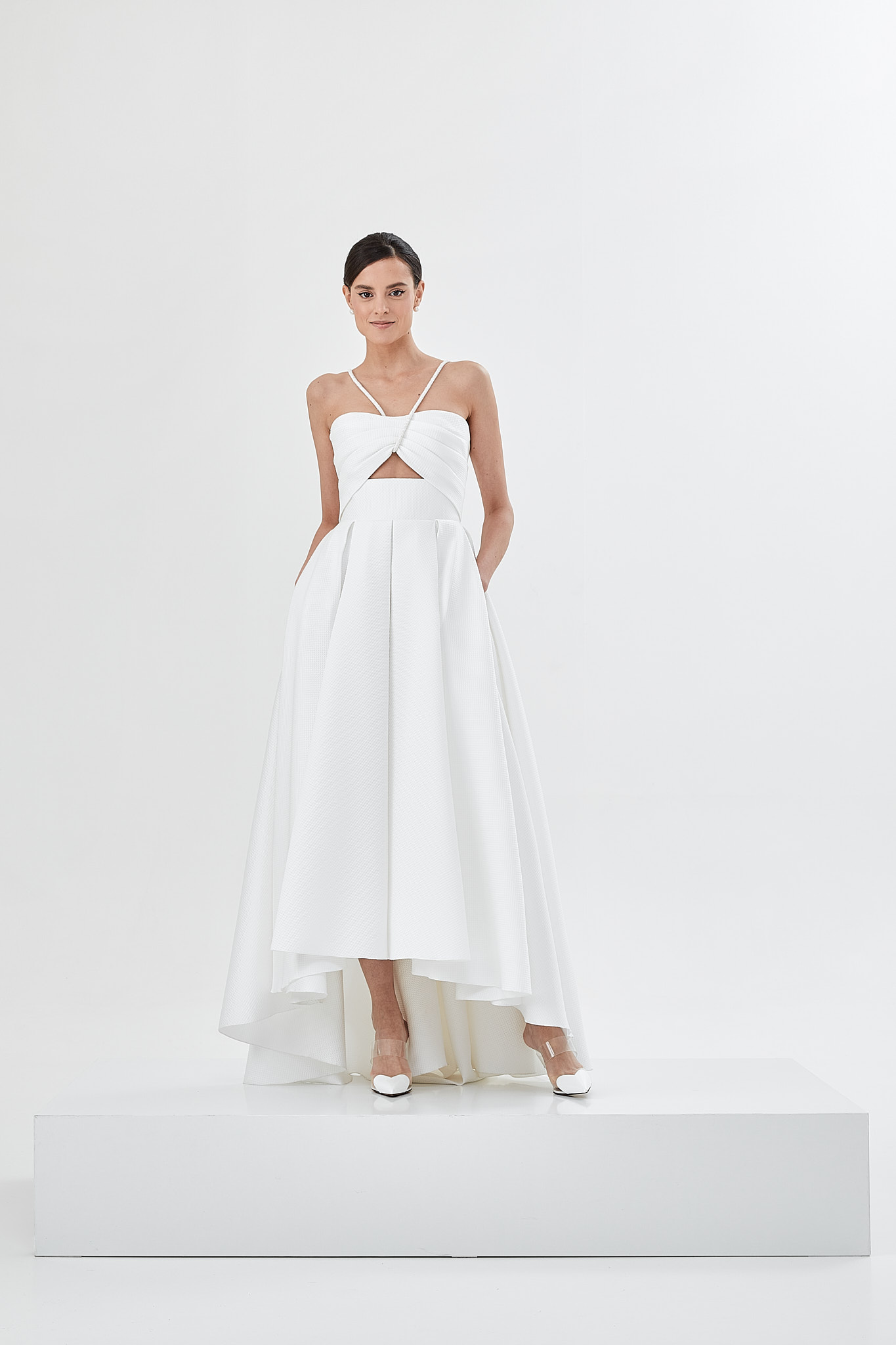 Defined through a high low skirt of an innovative texture, featuring structured drapes, pockets, geometric lines and accessorised straps, Viva is a modern wedding dress with a feel of effortless sophistication.