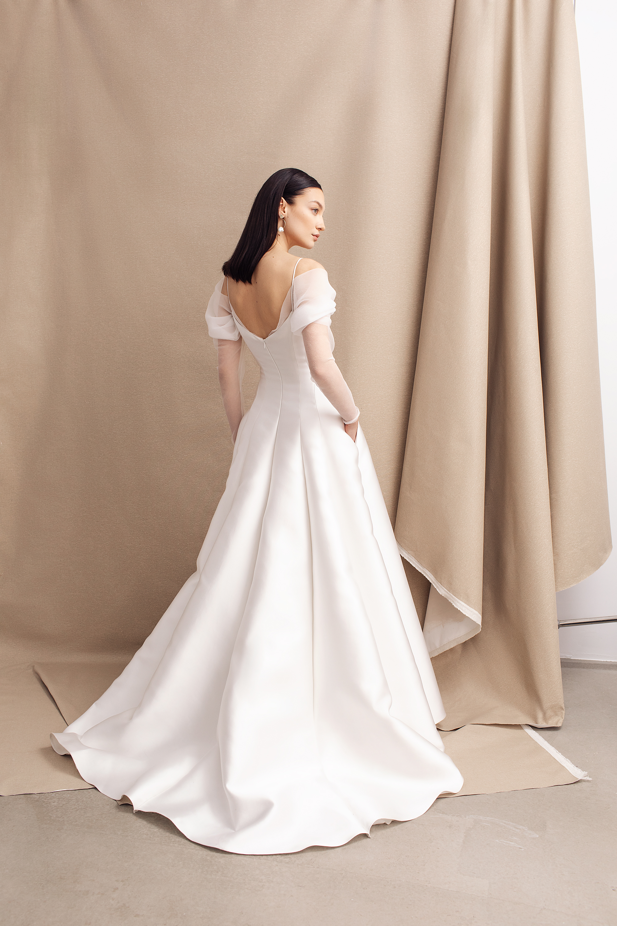 DRESS BALLGOWN SCOOP NECK LONG SLEEVES TAFFETA IVORY MINIMAL VOLUME STATEMENT SLEEVE