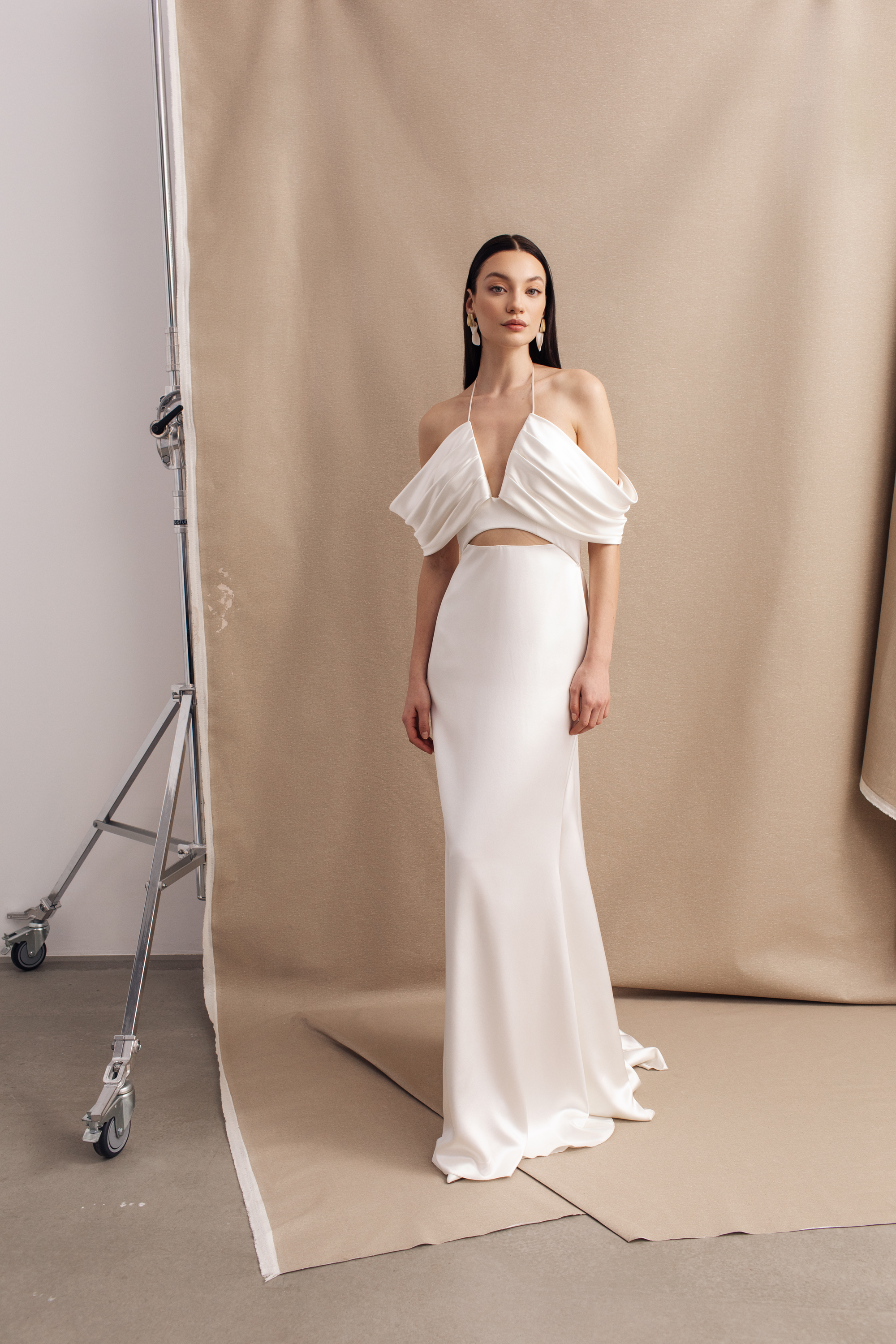 DRESS OFF-THE-SHOULDER SILK IVORY SPAGHETTI STRAPS FITTED MINIMAL