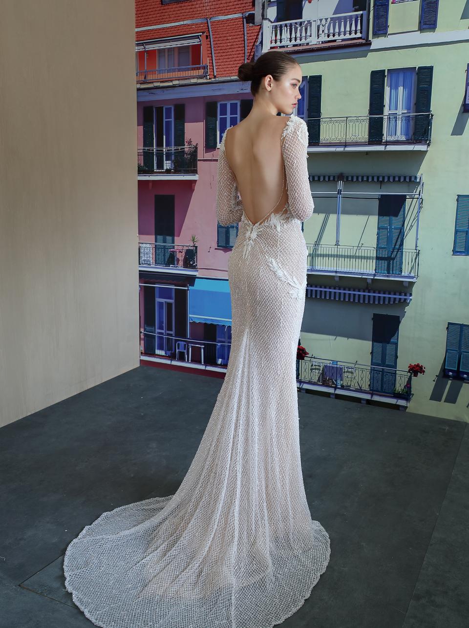 A sheer mermaid dress made entirely of sparkly beaded fishnet with intimate beaded fringe details and hand embroidered floral accents. This sensual dress offers a plunging v neckline, drop low back and detachable sleeves.