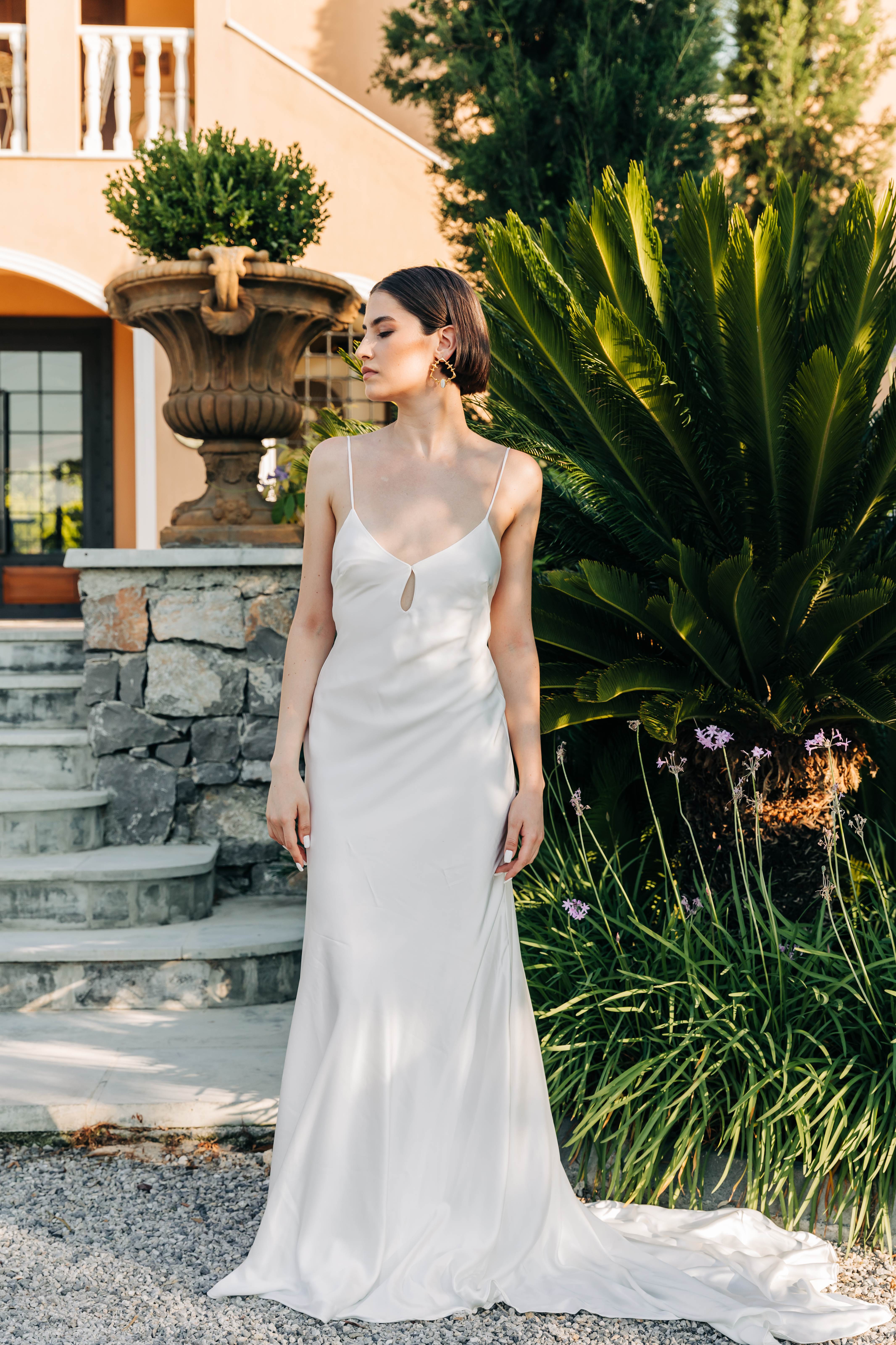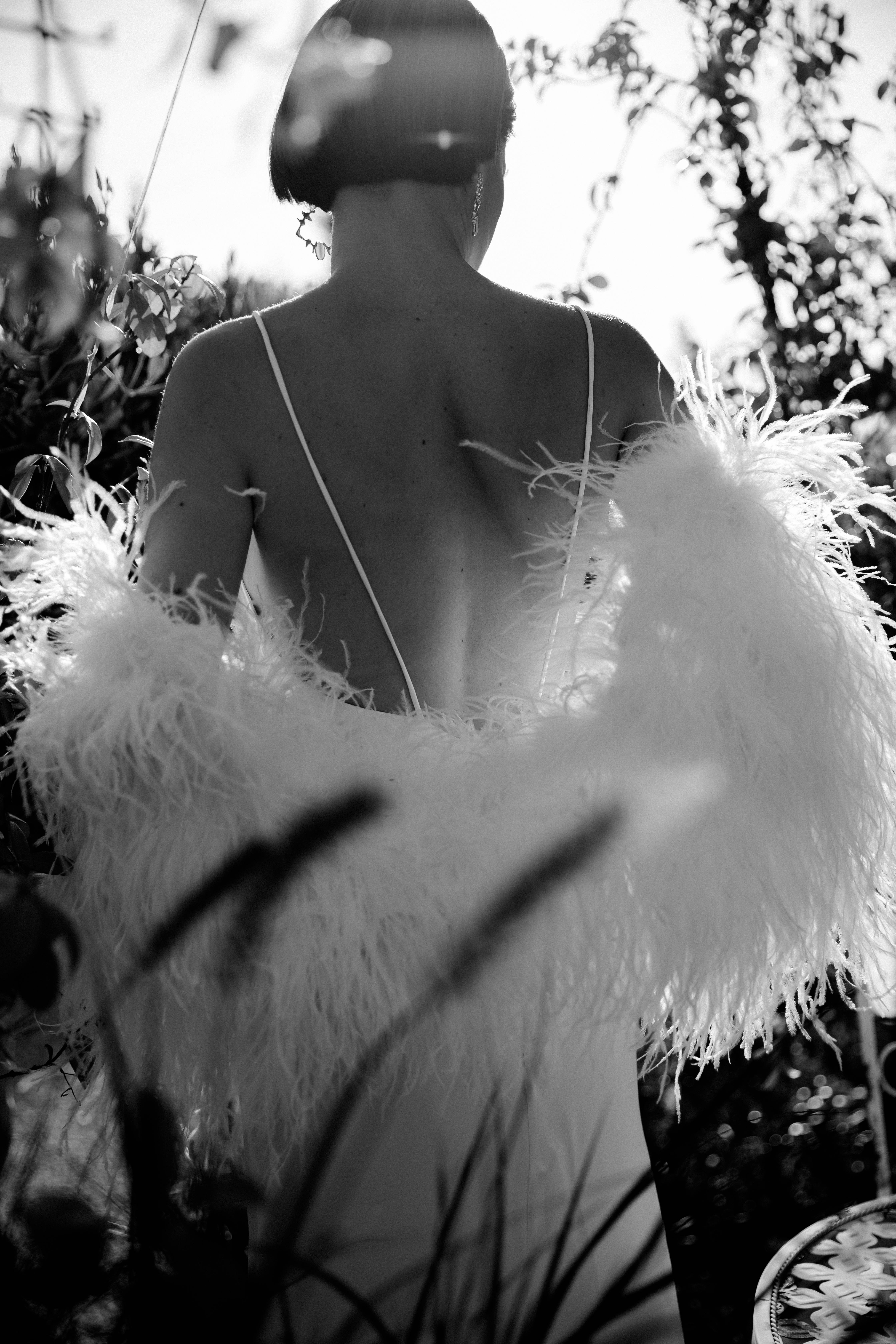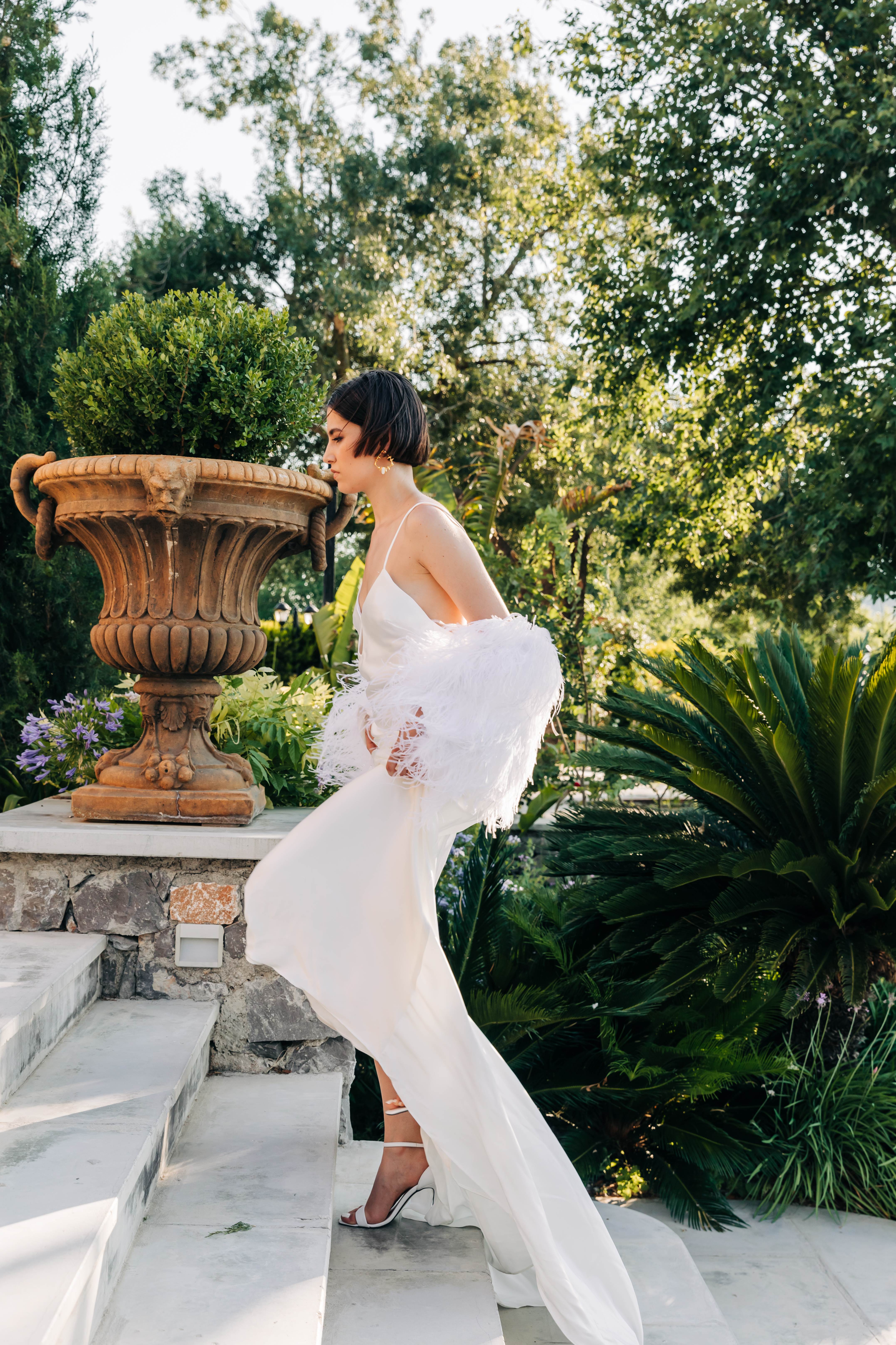 DRESS TWO PIECE SLIP SCOOP NECK SILK SATIN OFF WHITE SPAGHETTI STRAPS FEATHERS BACKLESS CIVIL CEREMONY PARTY RELAXED MINIMAL COMFORT CAPE/JACKET/COVER-UP
