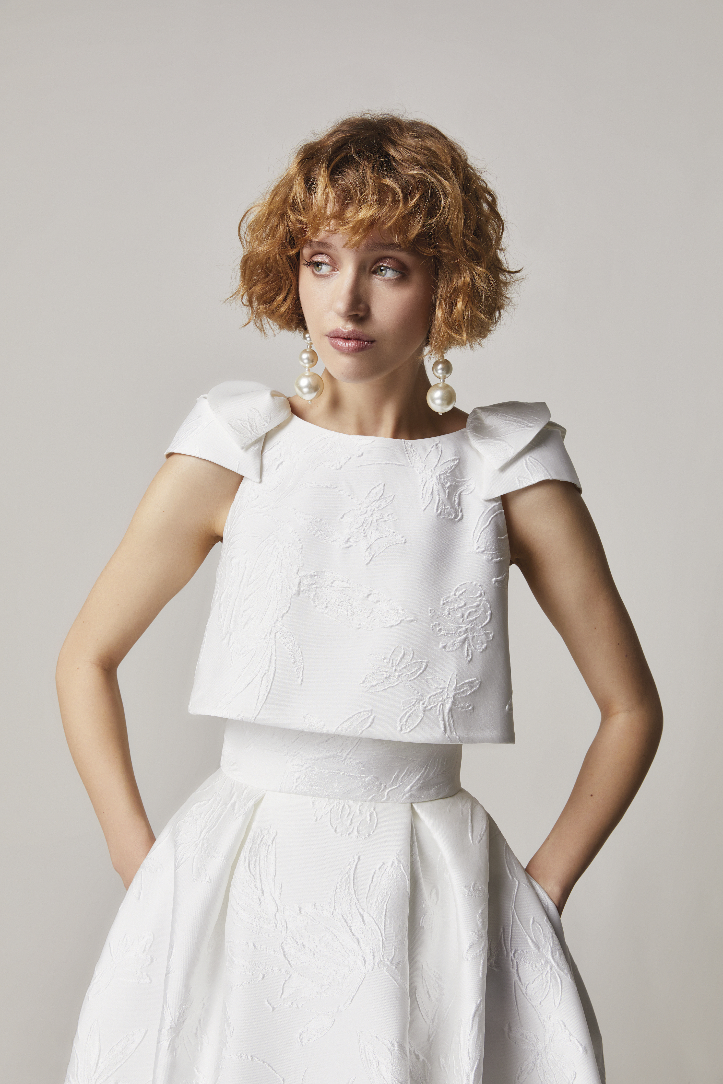 Strapless dress with wraparound skirt and bolero with short sleeves with petals in full brocade.