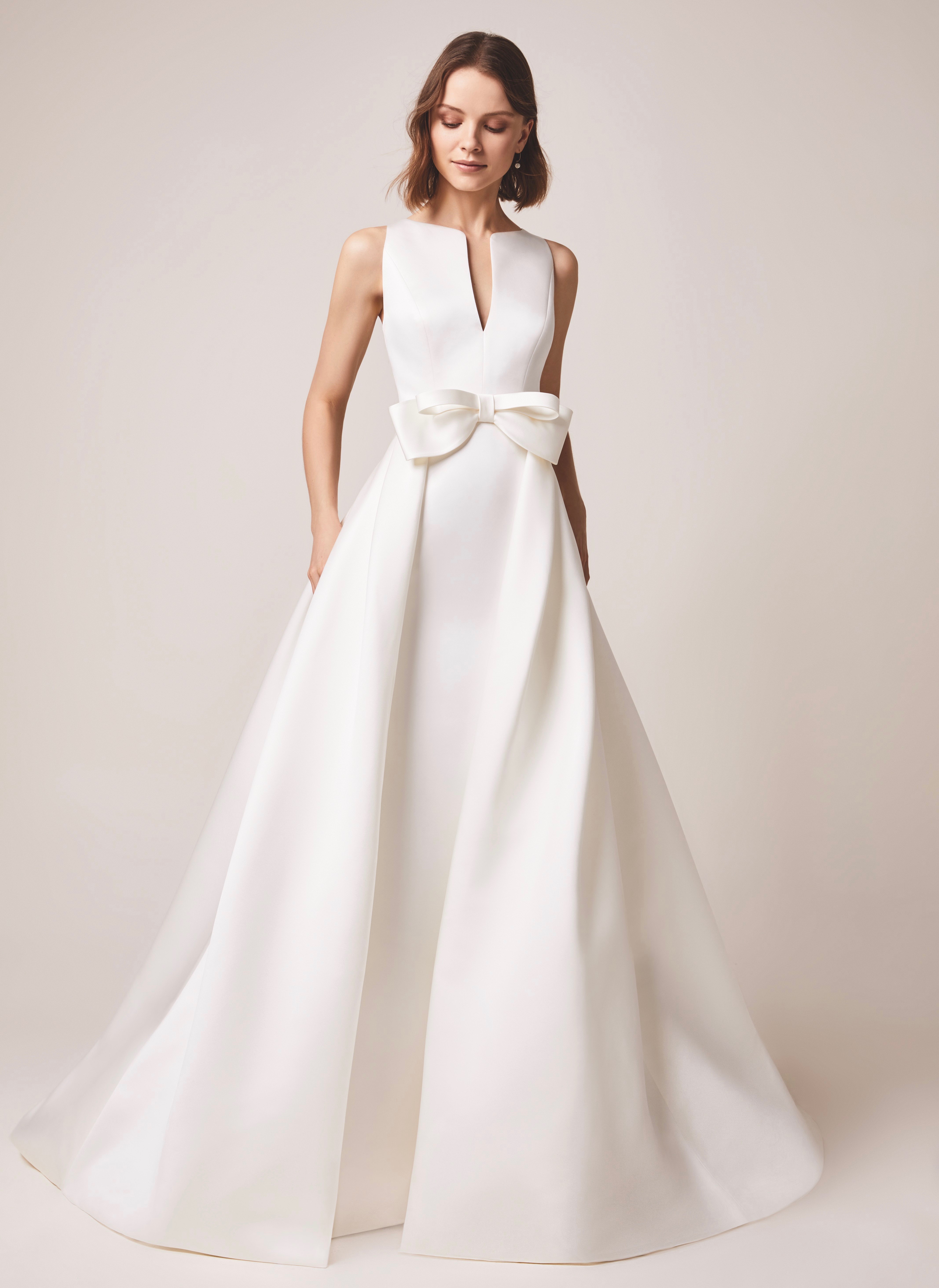 Satin mermaid dress with overskirt. Teardrop neckline and large bow on waist.