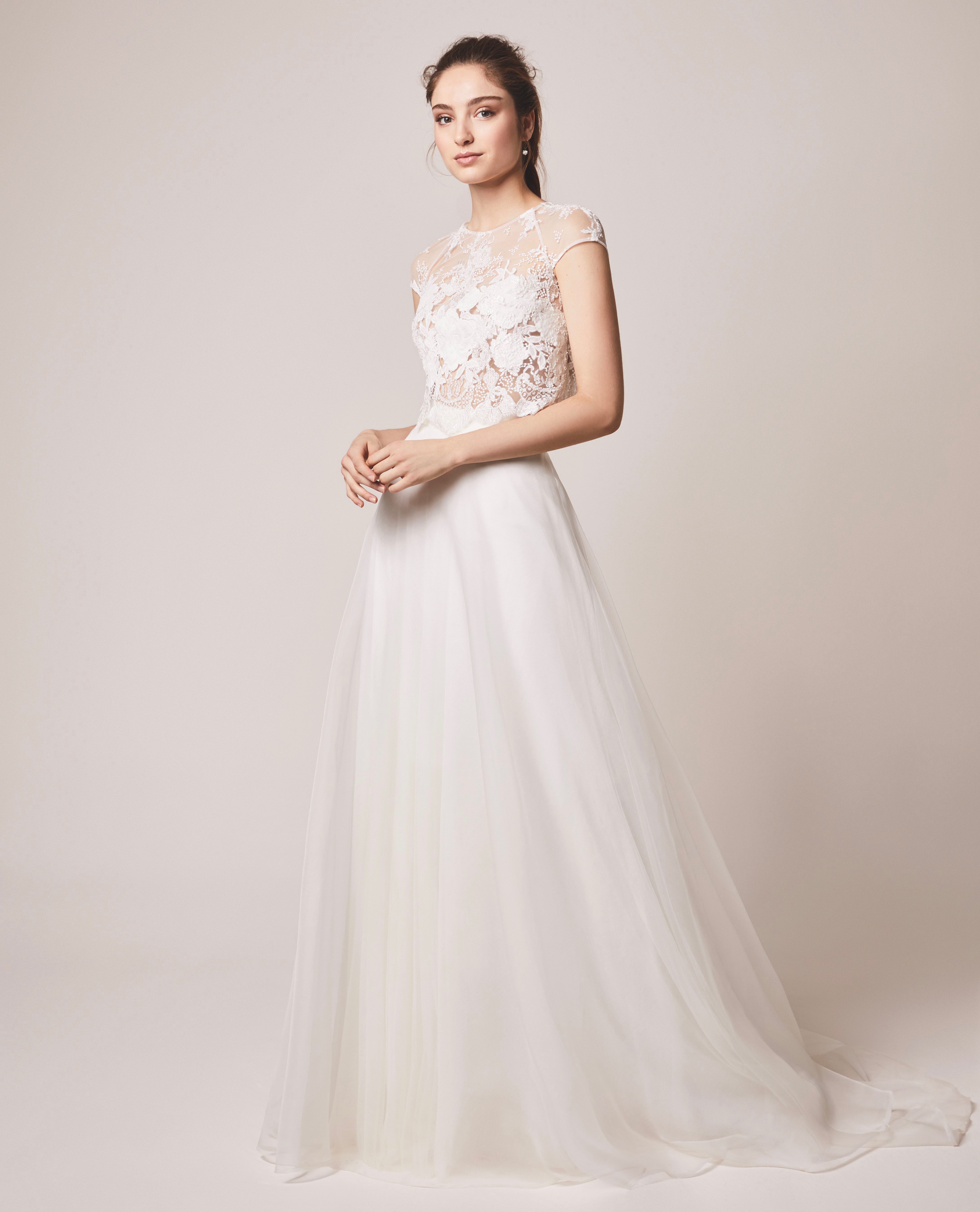 Beaded tulle crop top and guipure waistband with flowing silk voile skirt.
