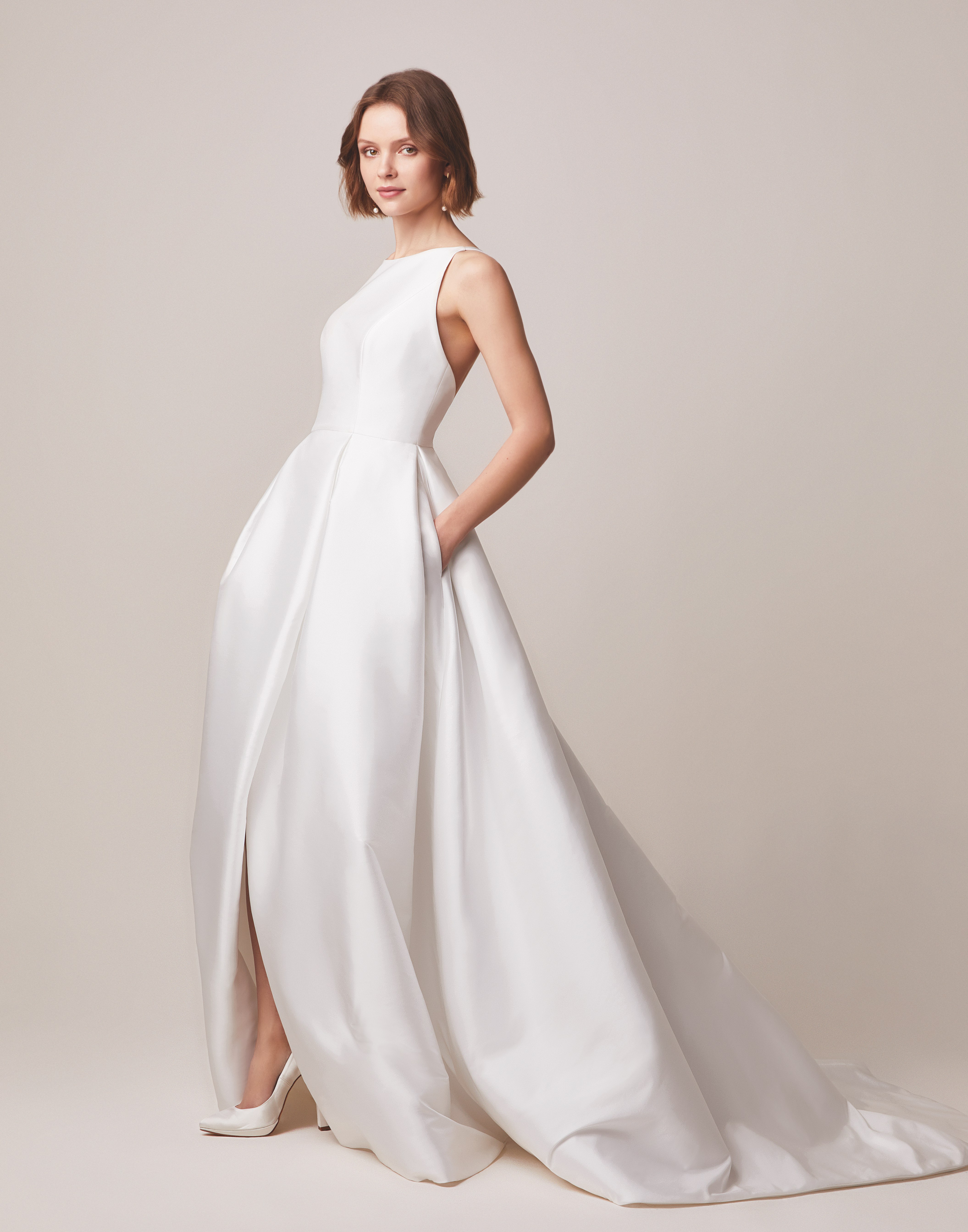 Mikado taffeta dress with wrap around skirt and crossover straps on back.