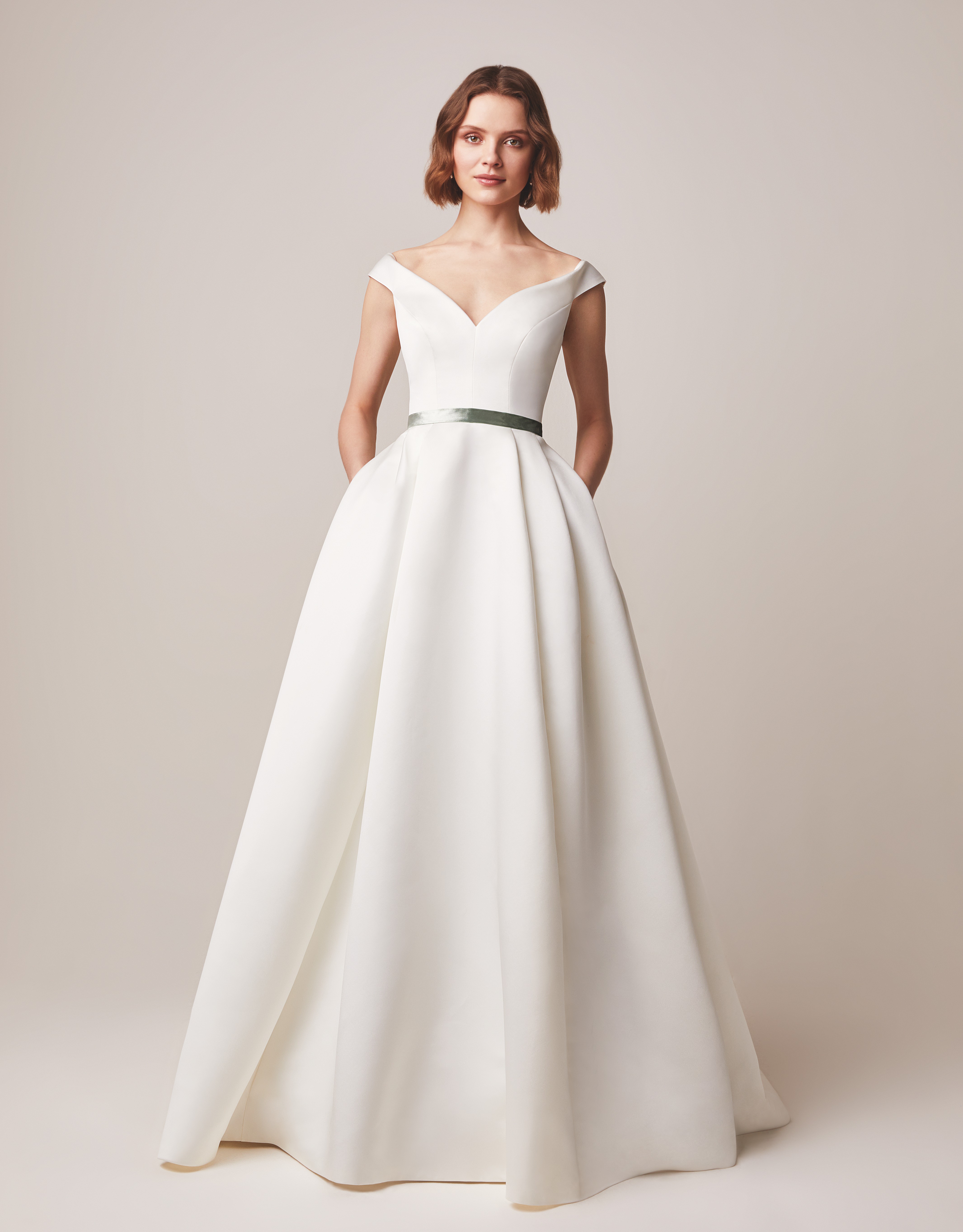 Dress with tulip shaped neckline, pleated satin skirt and waistband highlighted in eucalyptus green crushed velvet