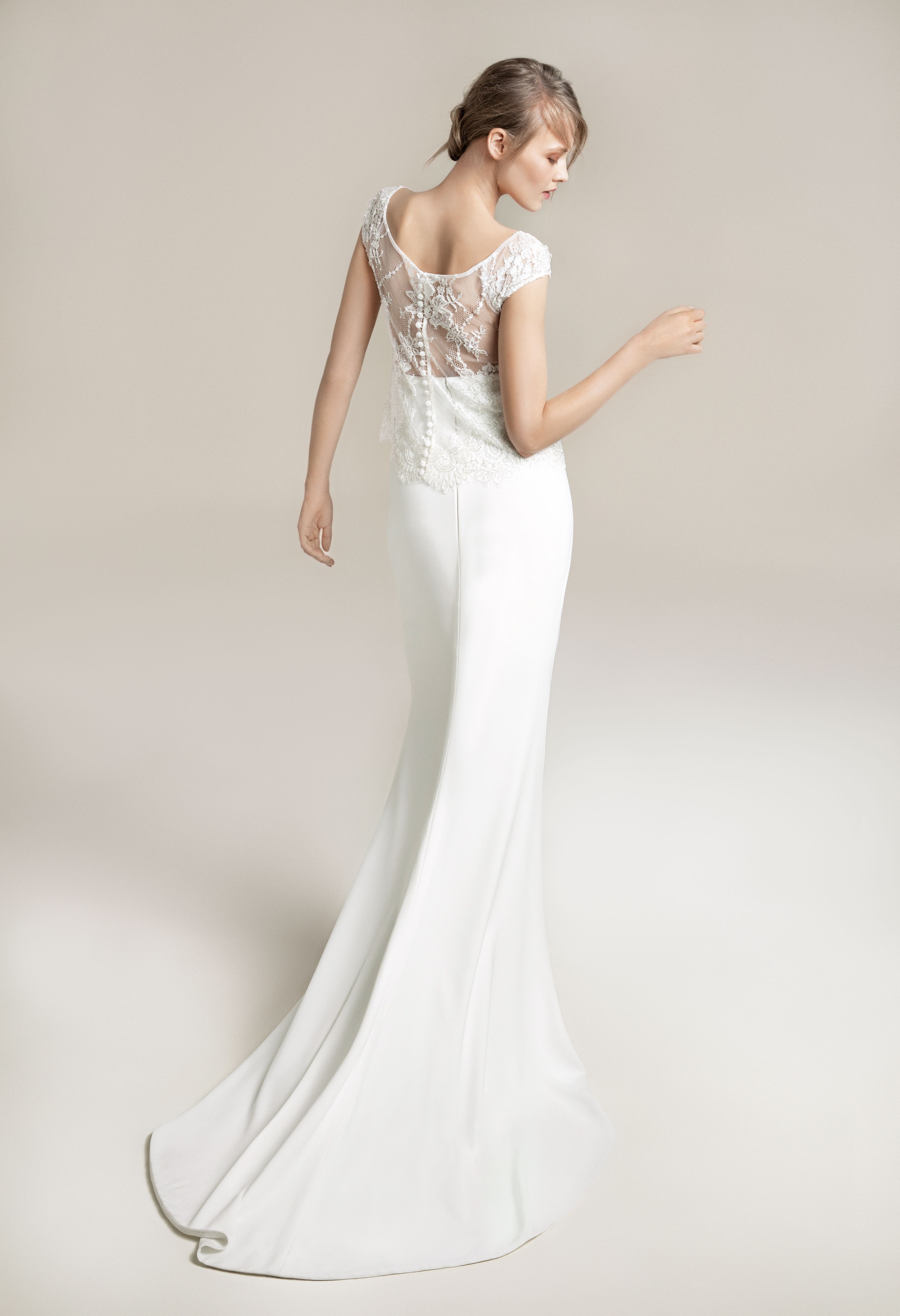 DRESS HIGH-NECK EMBELLISHMENT LACE SILK CREPE FITTED TRAIN