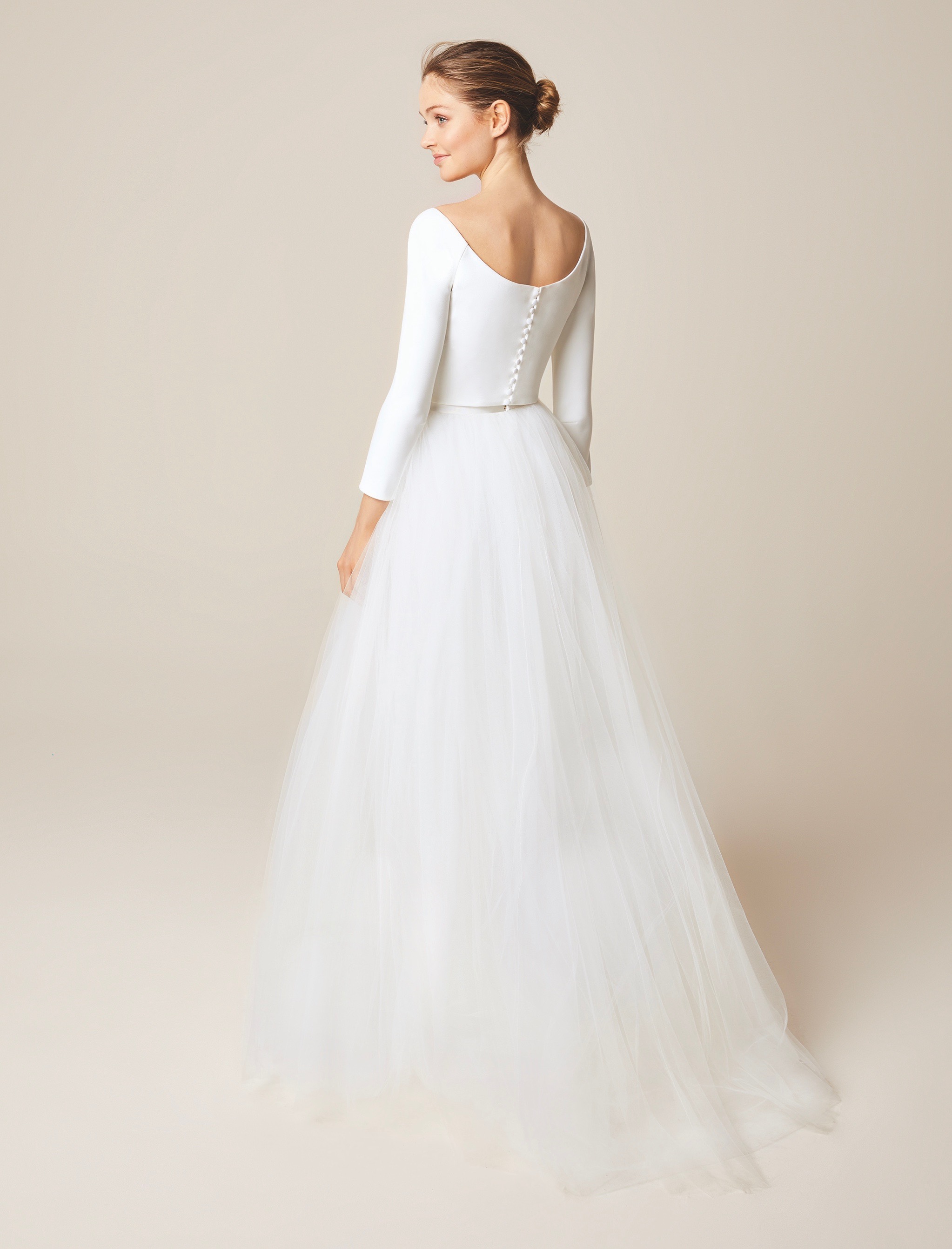 DRESS A-LINE SCOOP NECK LONG SLEEVES TULLE IVORY CREPE TRAIN