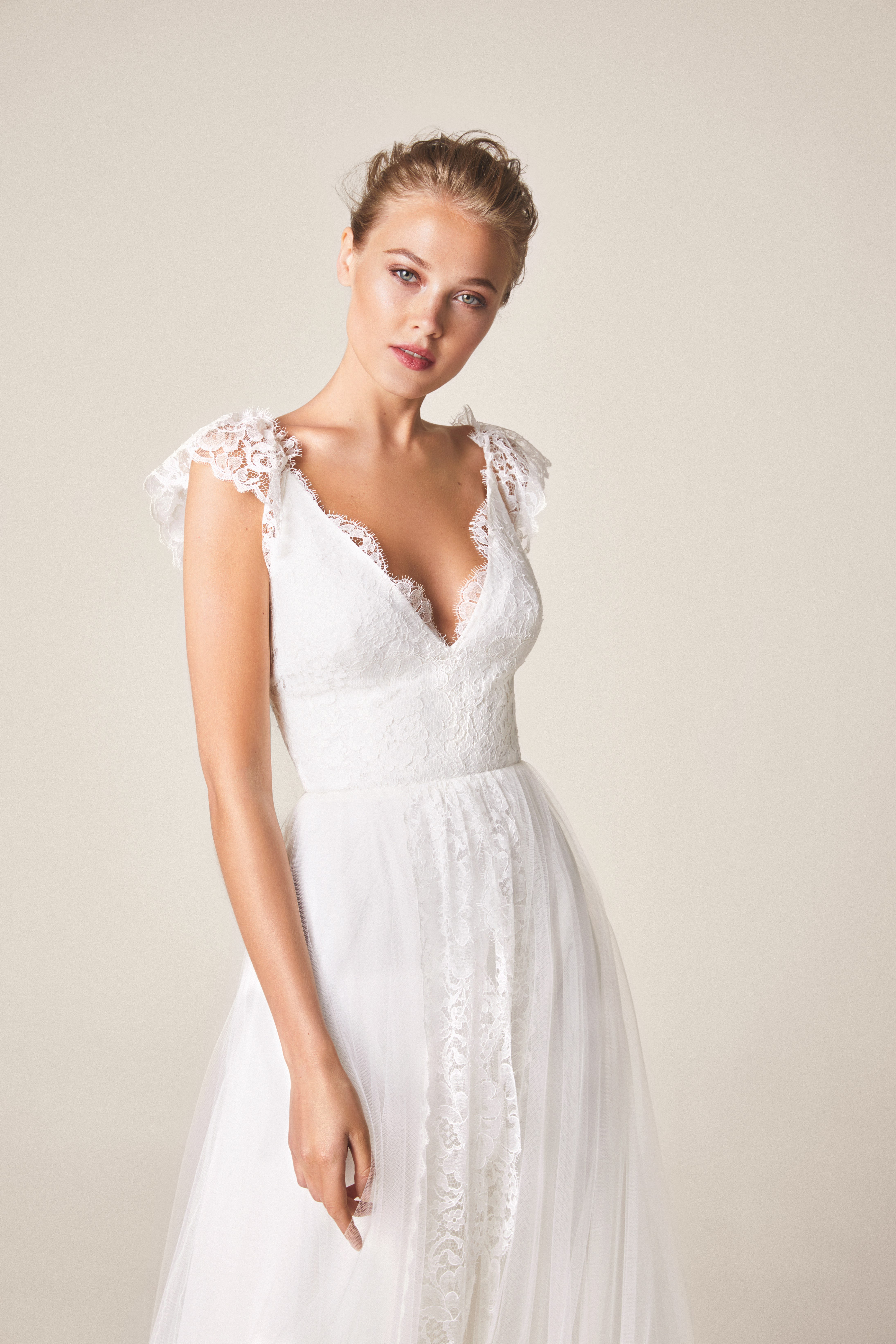DRESS EMPIRE V-NECK LACE TULLE BACKLESS TRAIN