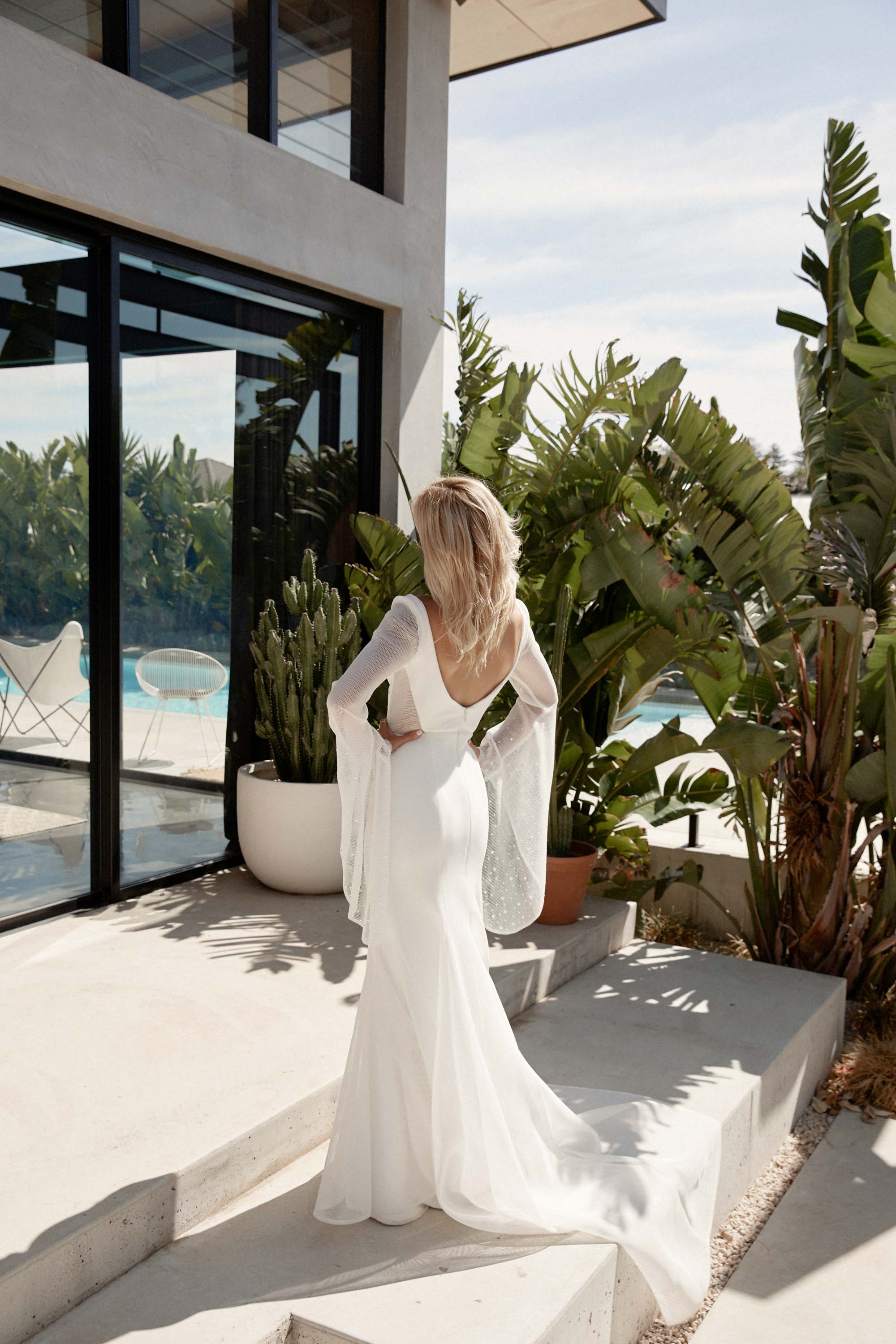 Blythe is a simple gown with statement details. Feel ultra-feminine with the flared pixie sleeves, adorned with scattered ivory pearls. The deep-V bodice is structured and demure, also featuring pearls all over to elevate your wedding day look. Own your own confidence and choose Blythe as your dream wedding gown.