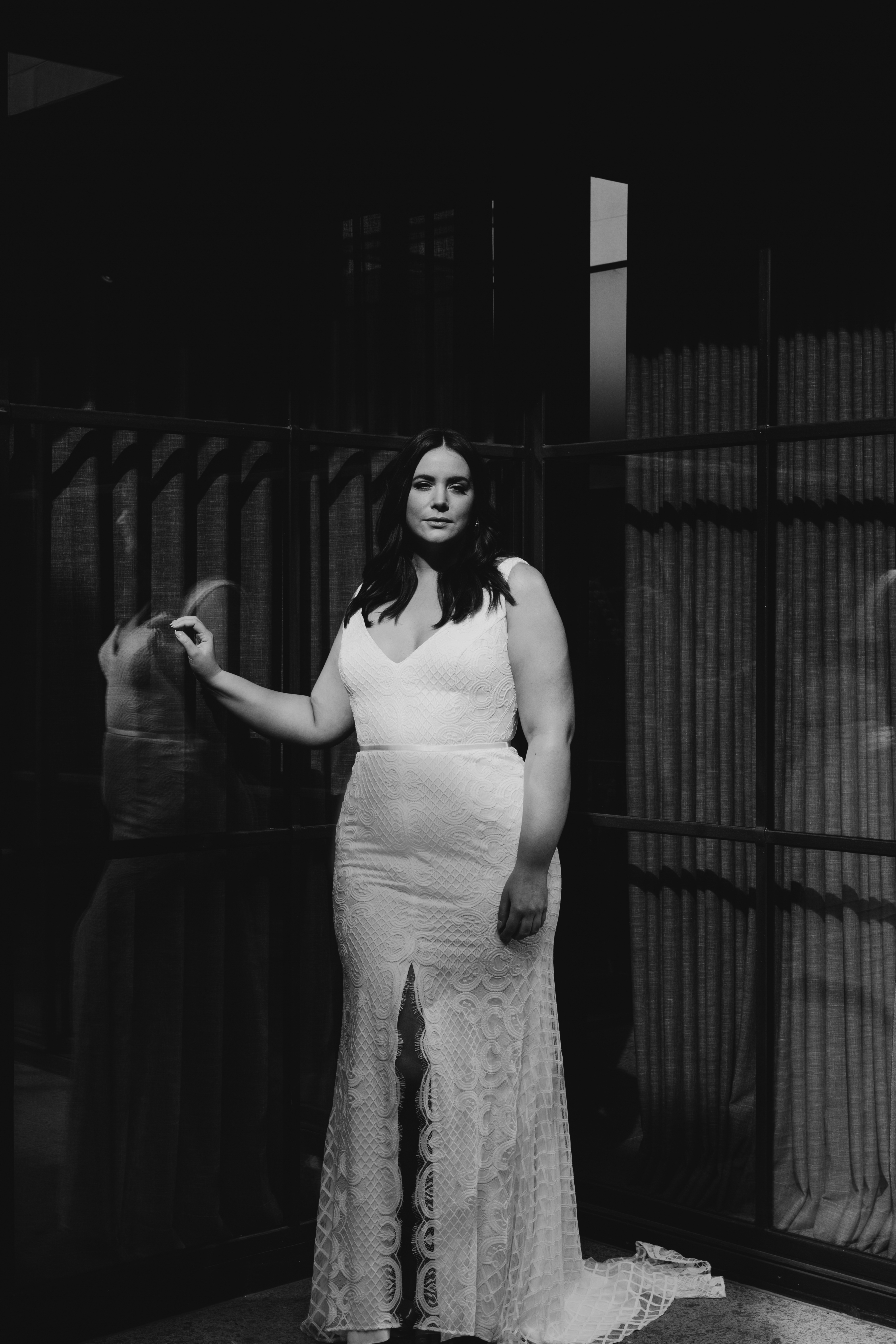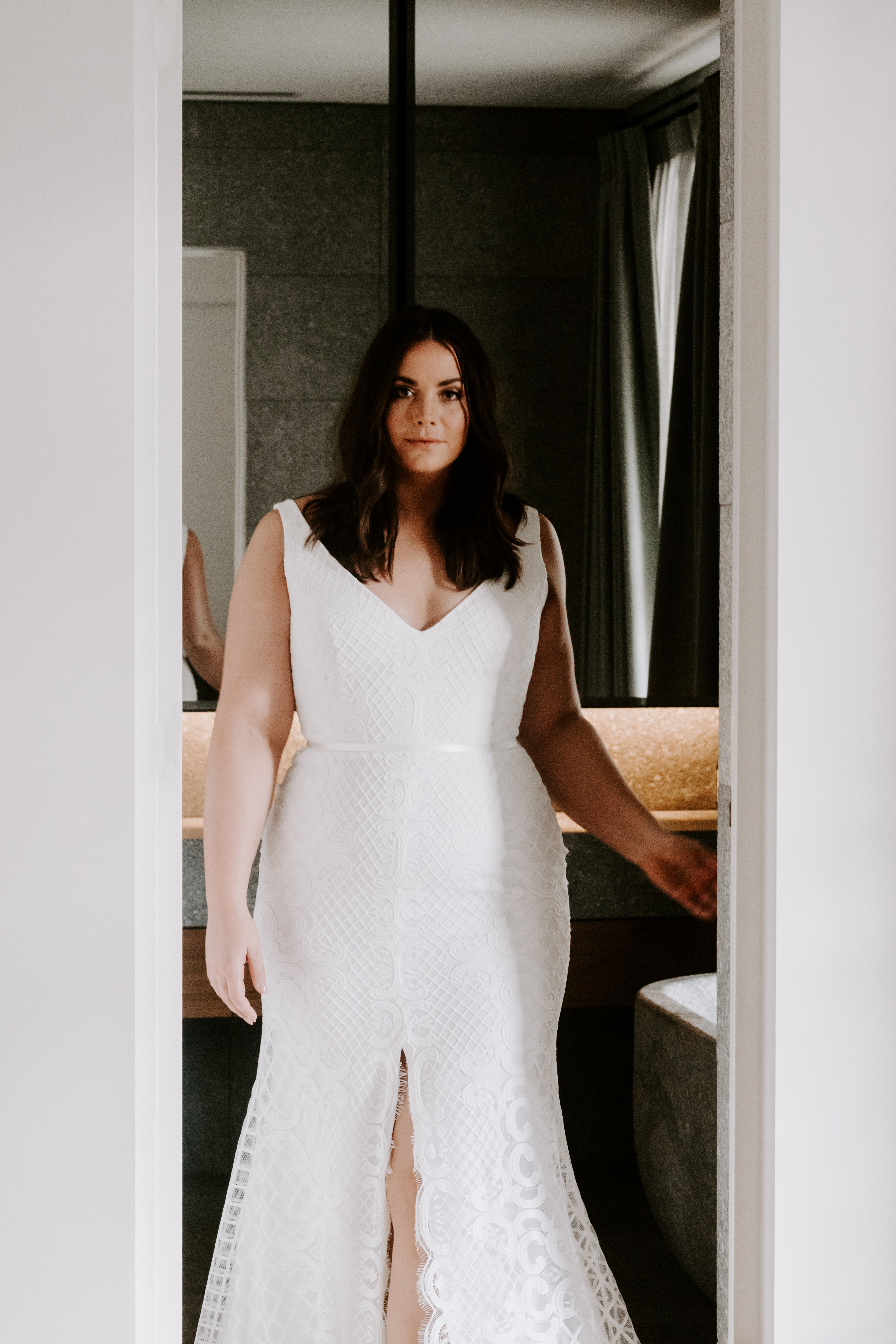 Form fitting and super sexy, the Bobby features a deep V-neck bodice with straps that sit on the edge of the shoulder. Delicate lattice lace and a centre front split, finished with a dramatic sweeping godet train.
