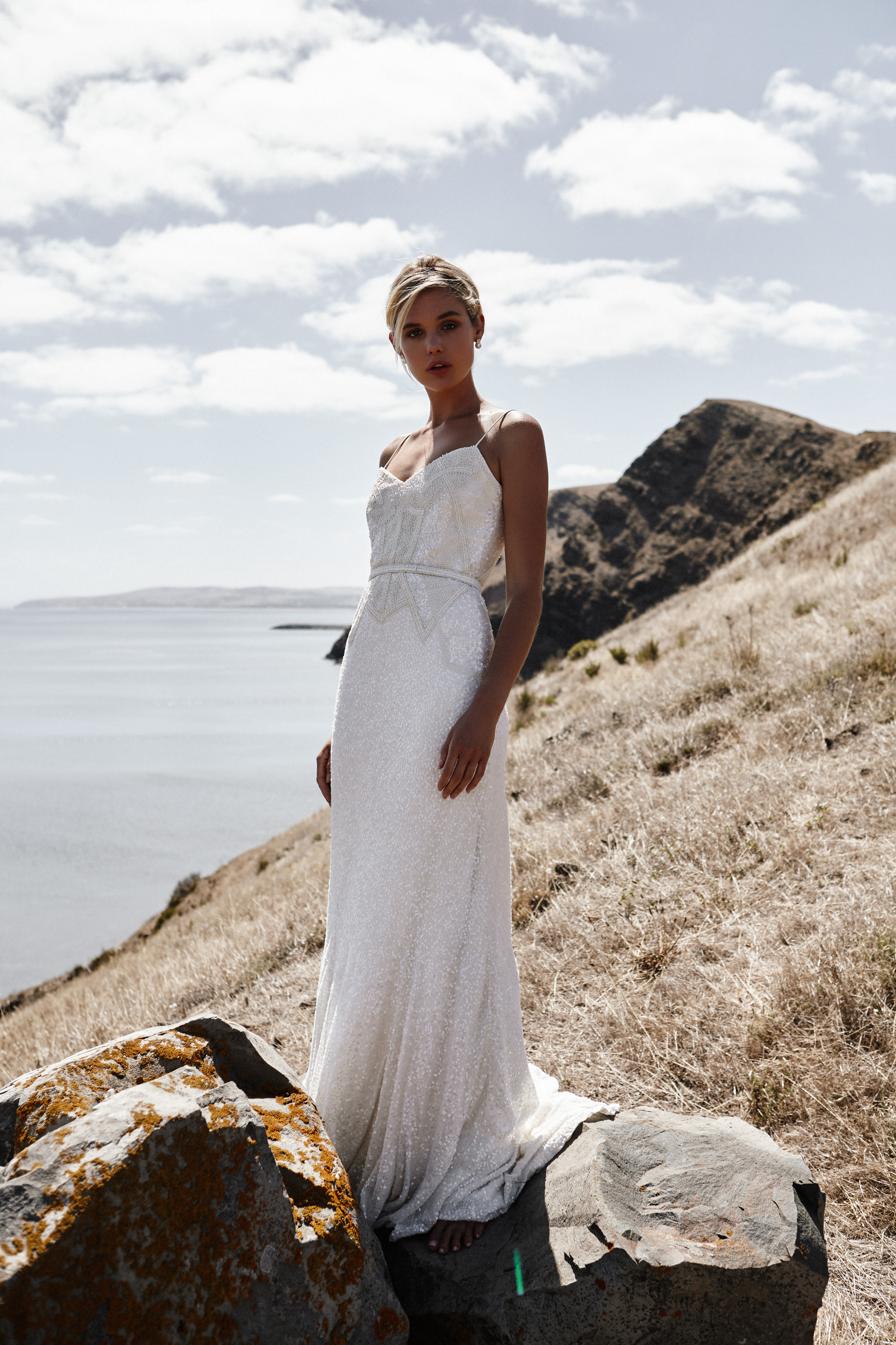The Addison gown features a stunning bodice with hand-beaded corset panel lines and beautiful floral detailing, finishing with our signature biased skirt and scattered sequins. This little beauty really turns it on when you add a detachable train.