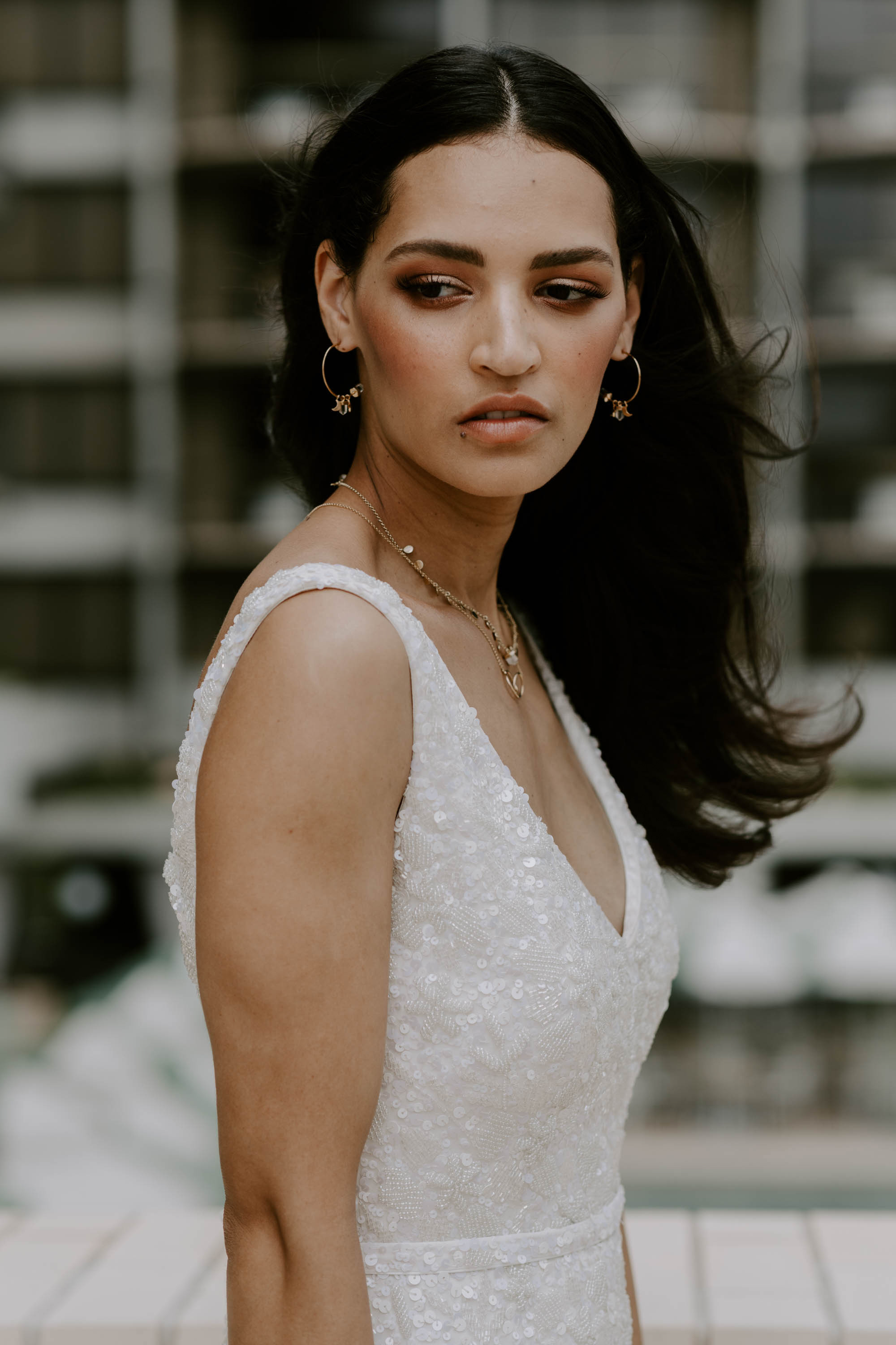 Georgina’s V-neck sits elegantly on the edge of the shoulders before finishing in a sensual low back. Heavy floral beading features throughout the bodice and tapers out into the form fitting bias cut skirt.