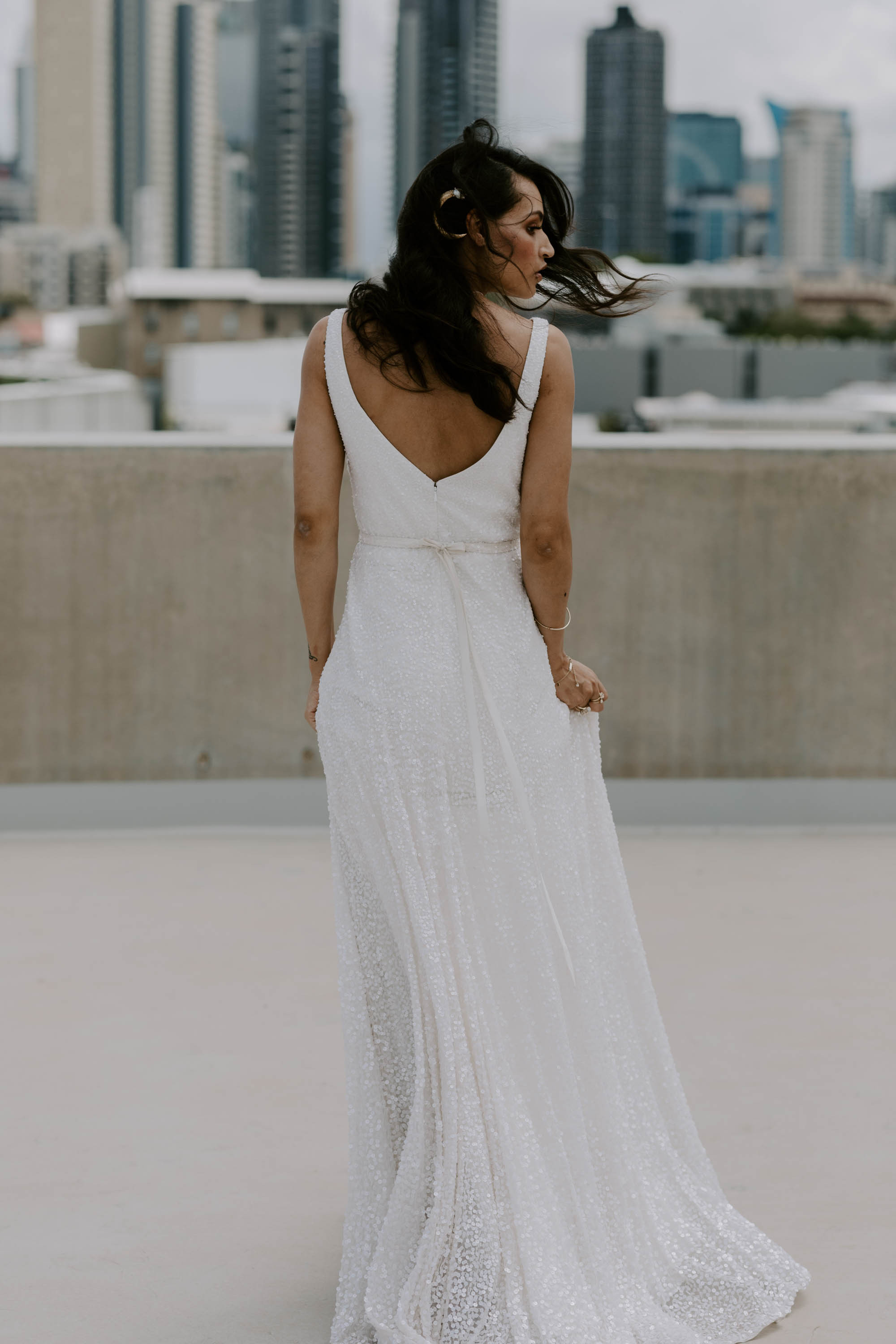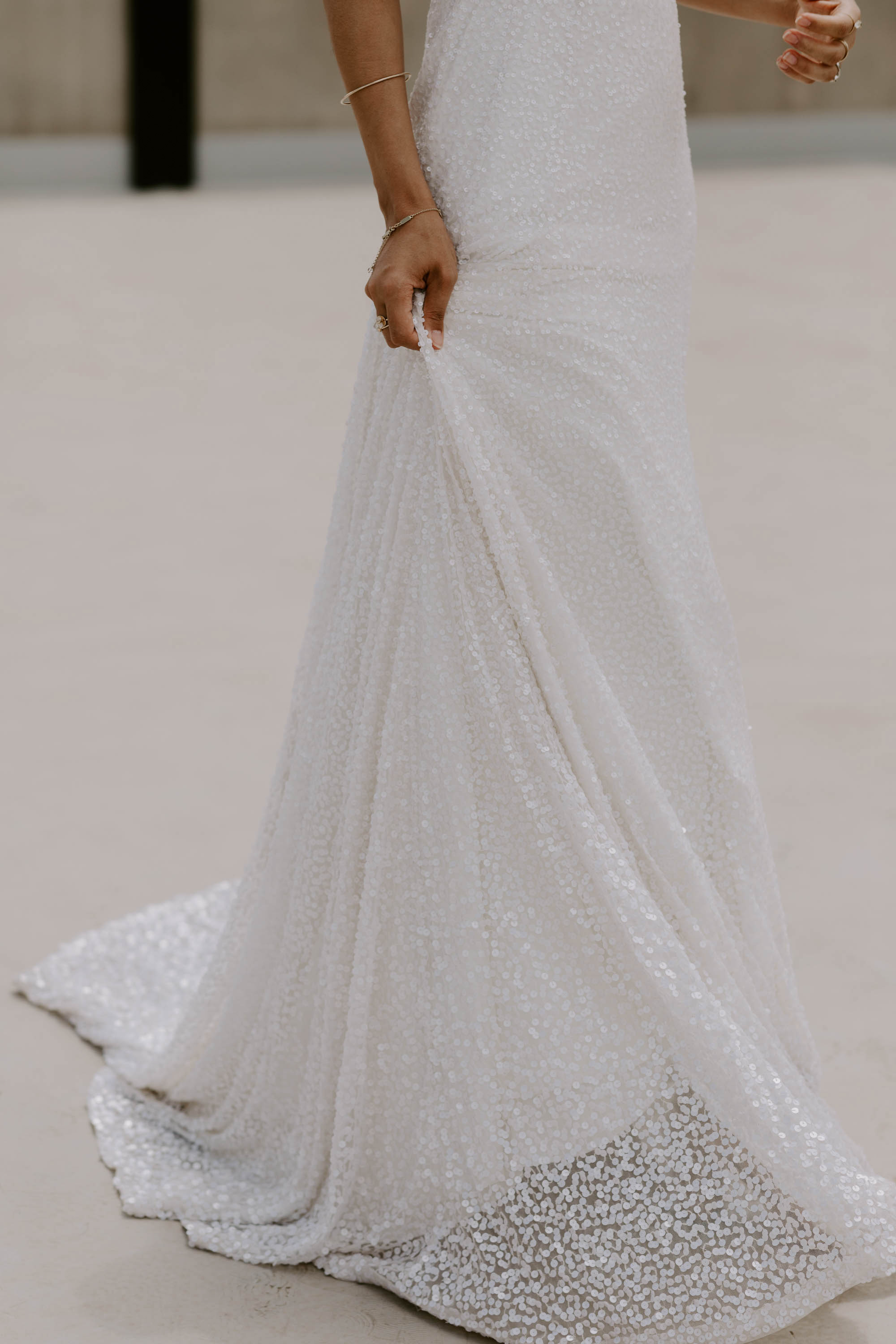 Lotus feature point is its incredibly cut A-line skirt which is fuller than any other gown in the LUXE collection, providing such romantic movement when walking or twirling as the sequinned fabric drops to the ground. Lotus glides off the hips softly, perfect for the bride wanting a more relaxed but as equally flattering skirt. Fine beads cover this wedding gown and the bodice is framed with a wide V-neckline.