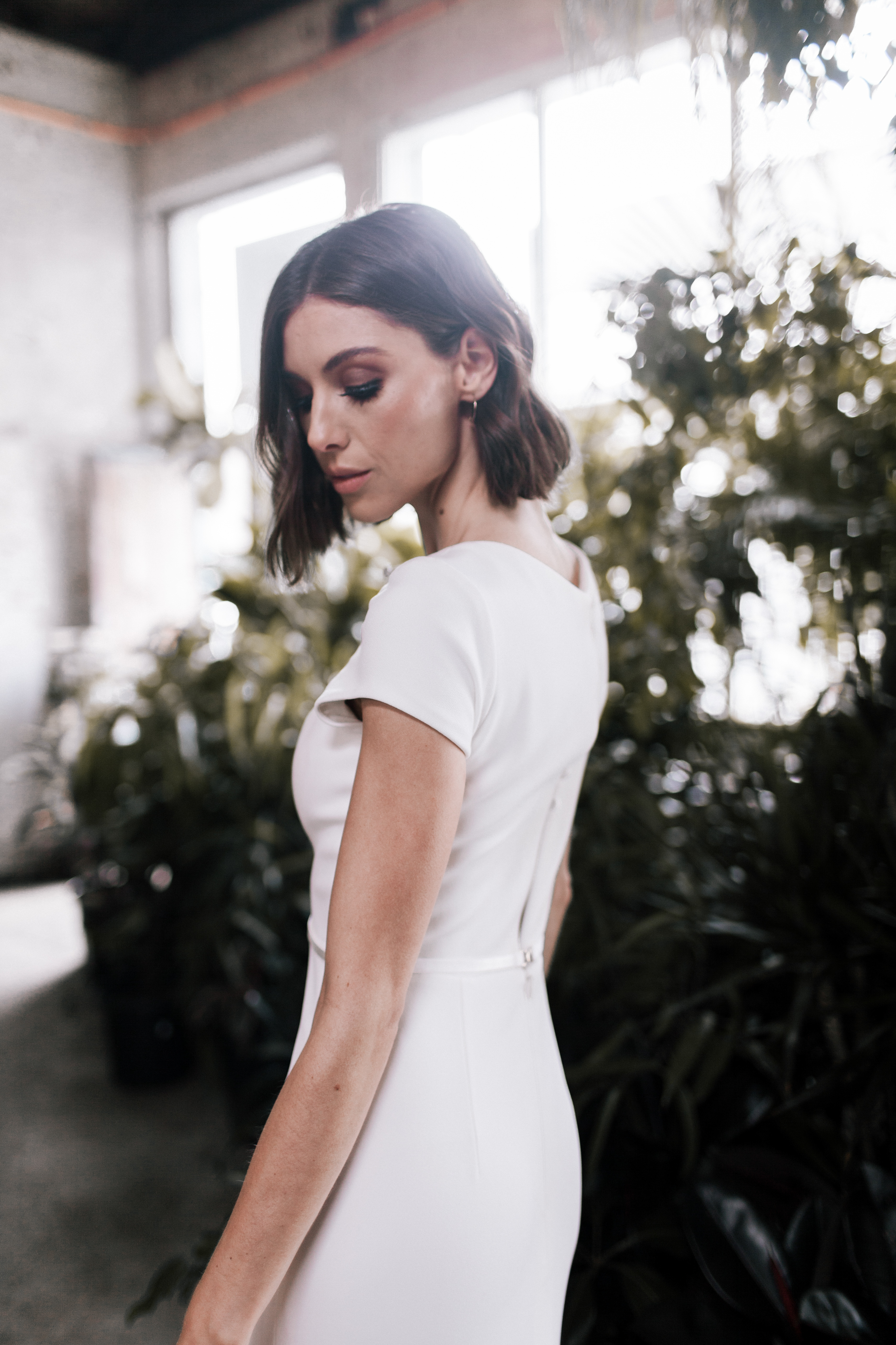 Timeless with subtle detail and a contemporary silhouette, Clarissa features a high neckline with a centre split button detail, elegant cap sleeves and a dramatic train. The back is equally as beautiful, with a fine split and button detail down to the waist.