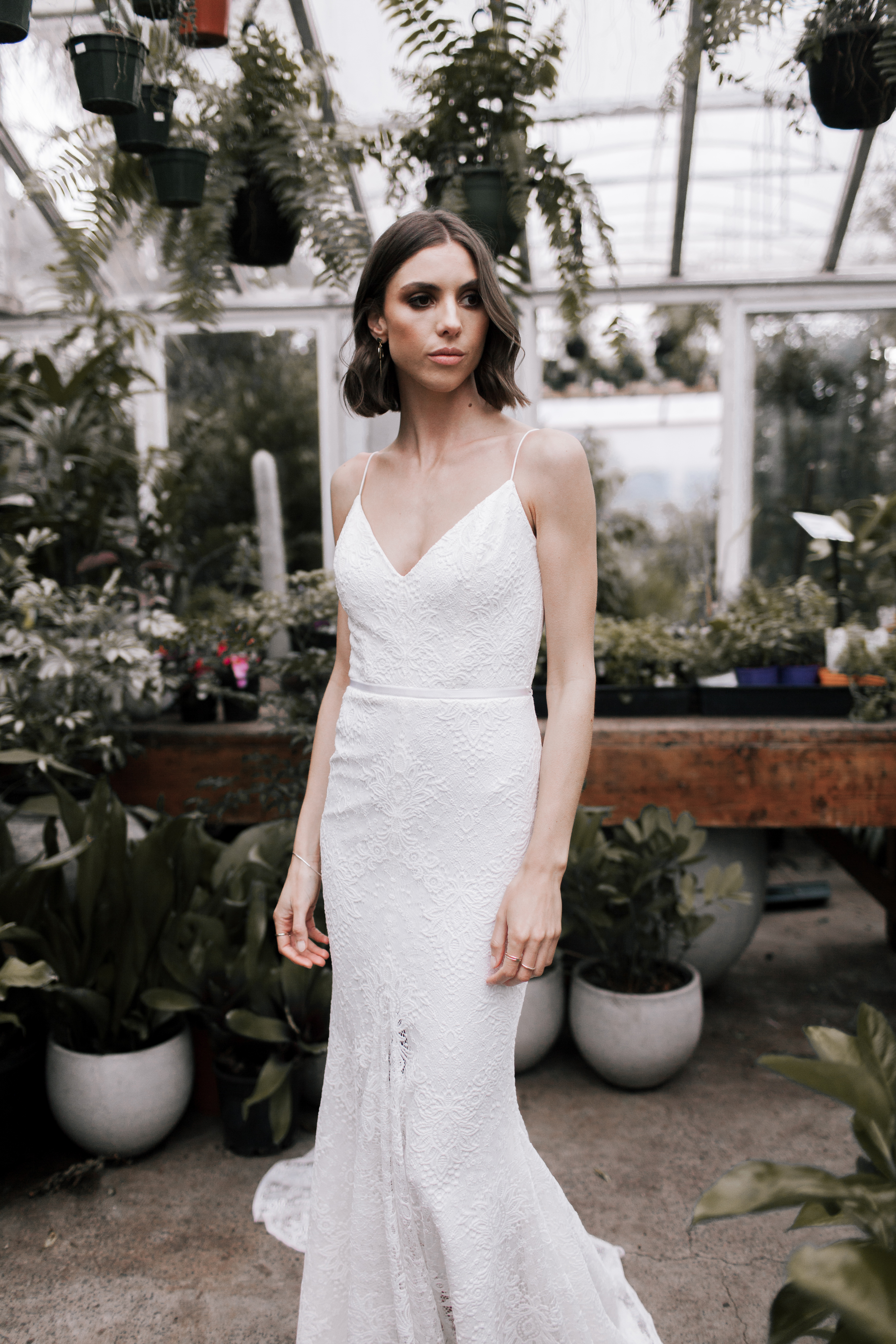 With a beautiful silhouette in the finest, most delicate lace, Justine is so elegant. We adore the spaghetti strap detail and that the centre front split in the skirt lining is draped with a closed lace overlay. Perfect for the bride that wants a split for movement and comfort, without revealing their leg or shoes.