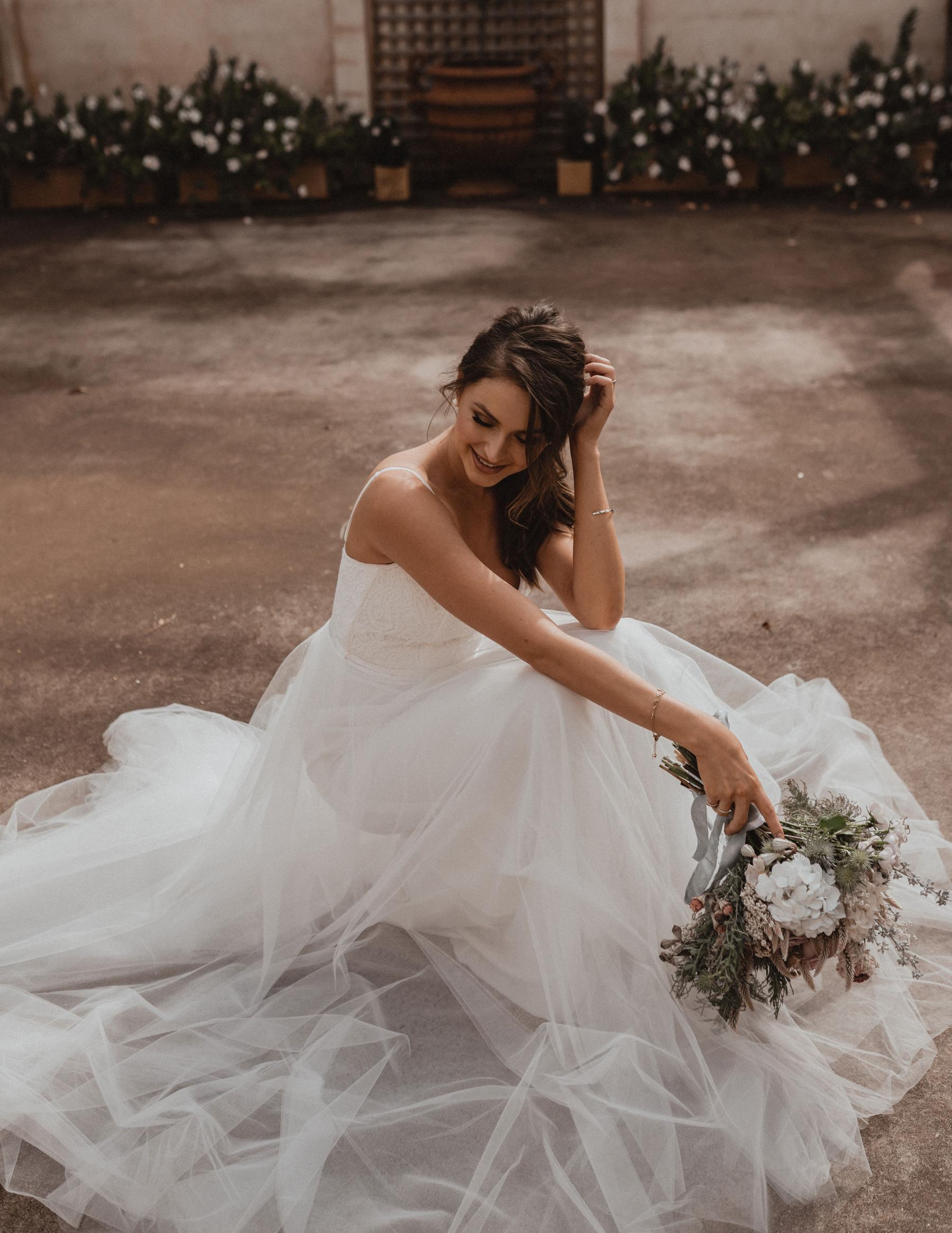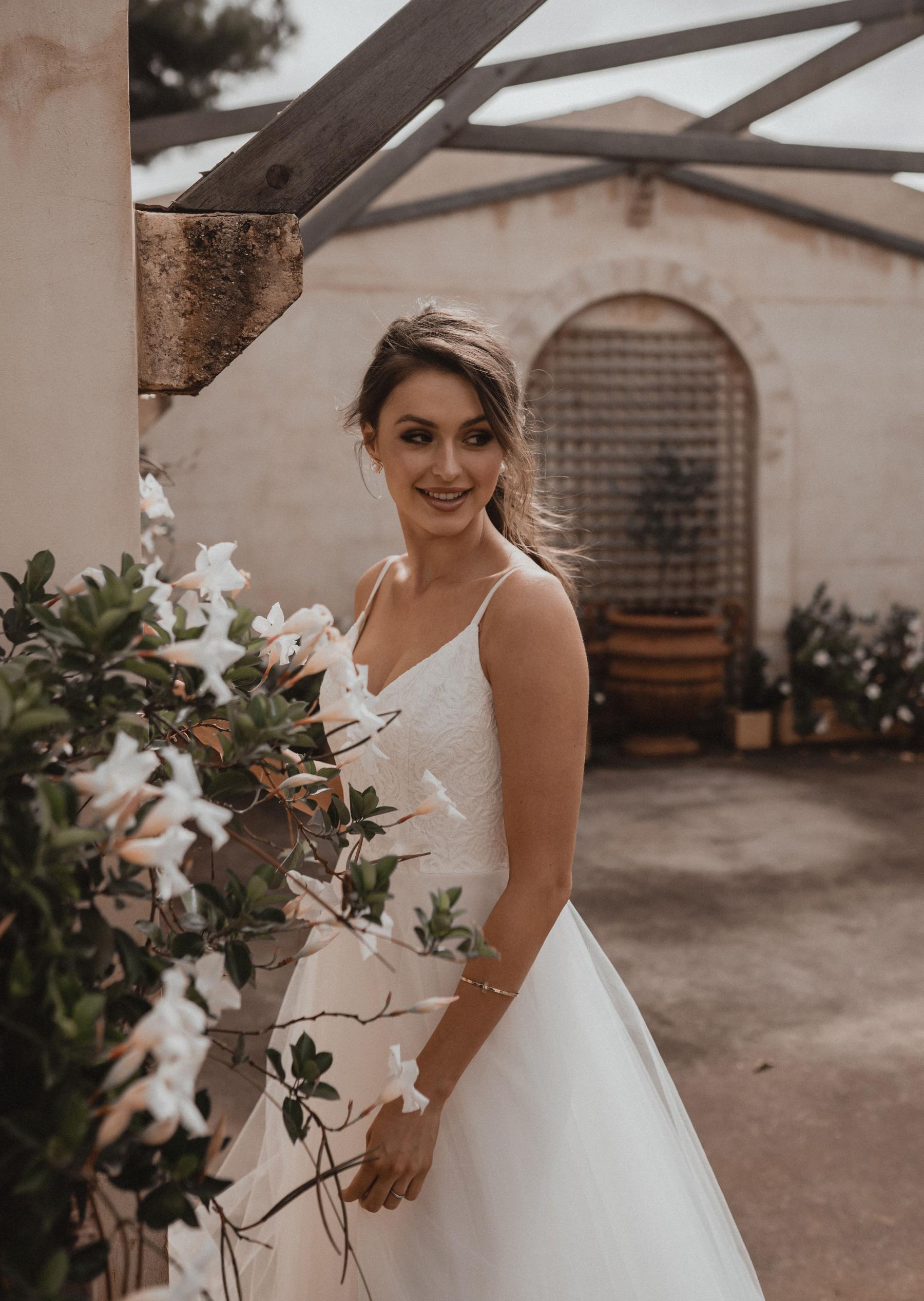 For that princess moment, the lace bodice of the Maisie wedding gown features delicate spaghetti straps and a full tulle skirt, perfect for the walk down the aisle.