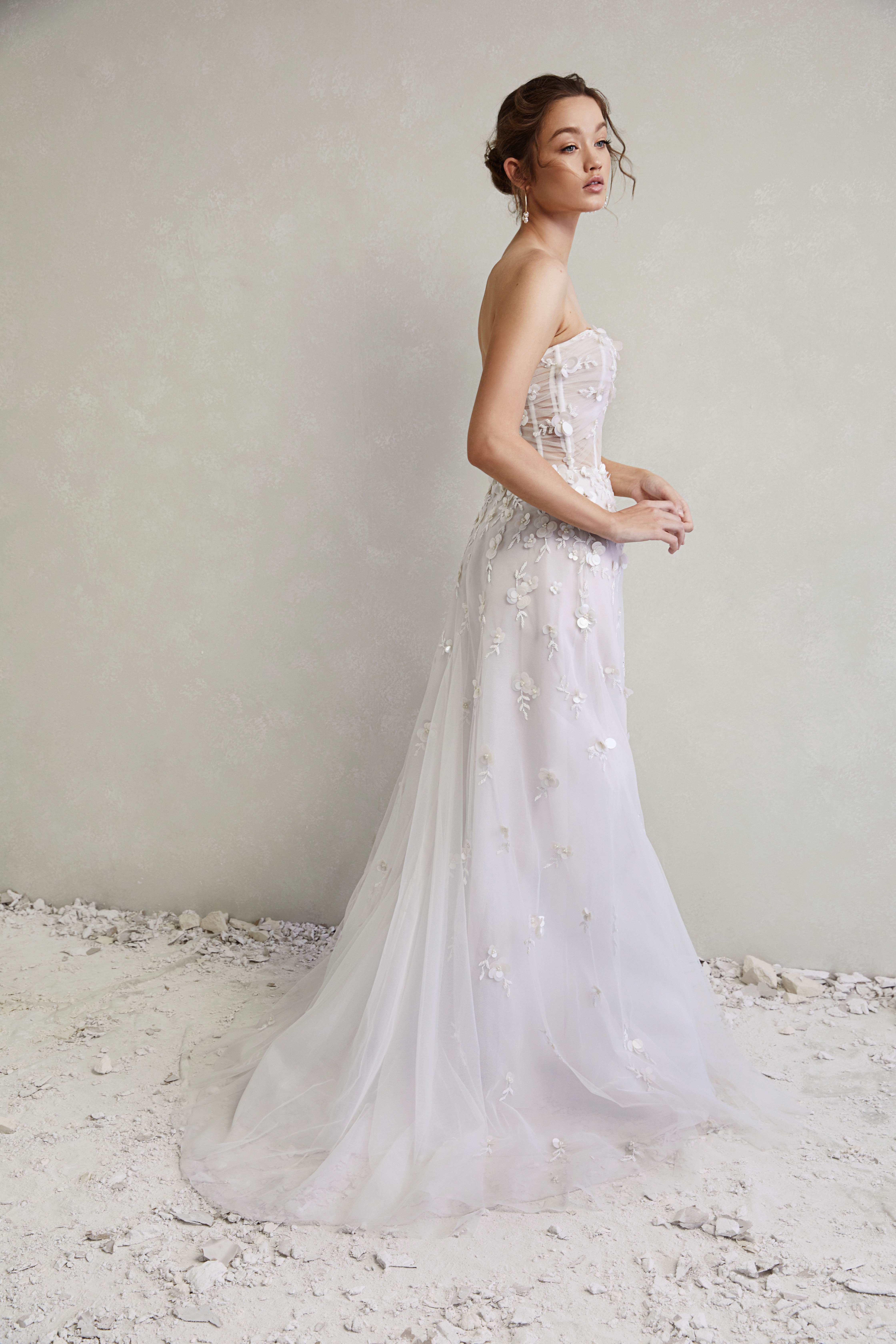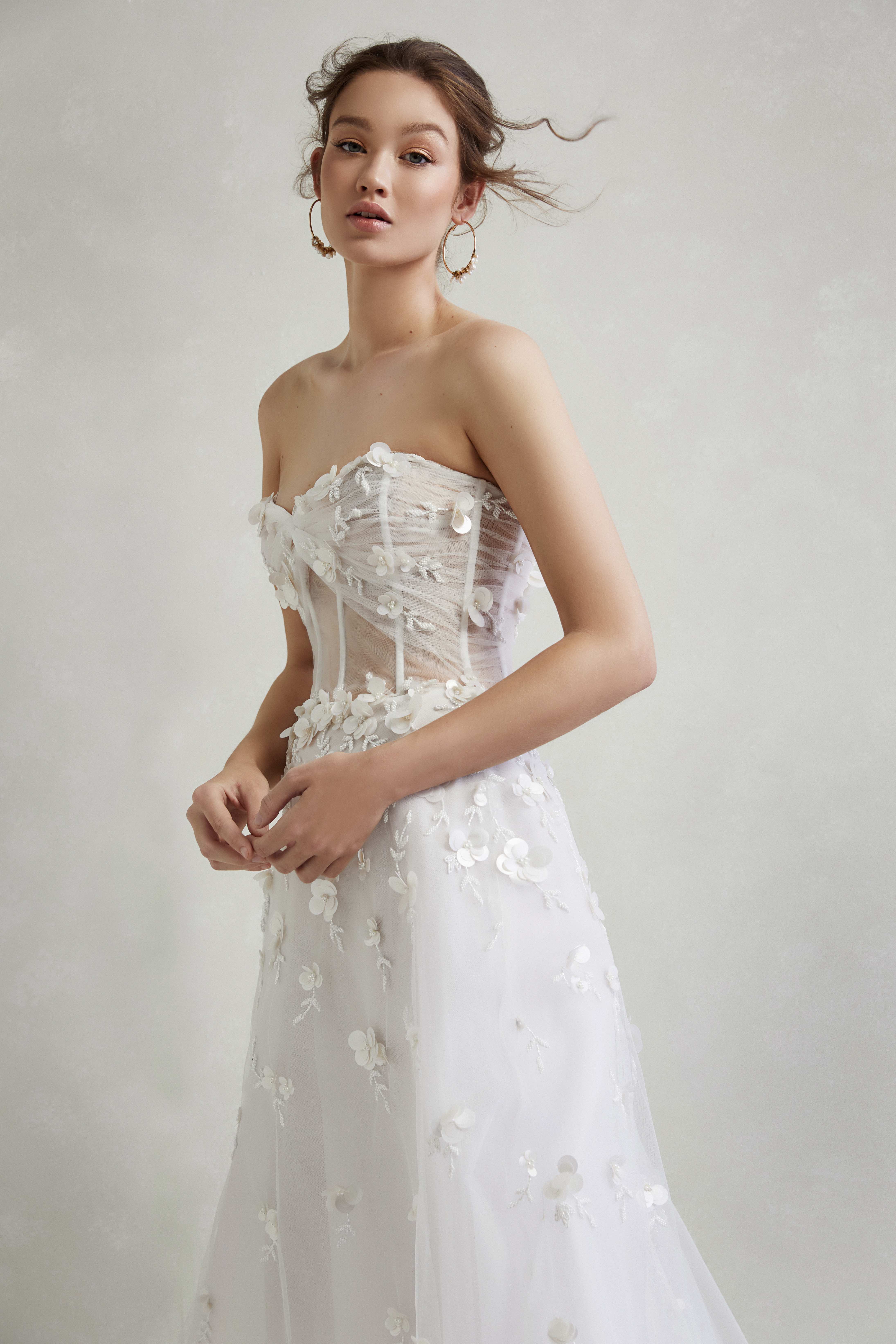 Custom Designed 3D sequin florals with seed beads, hand sewn on Japanese tulle and hand draped over our signature corset bodice.