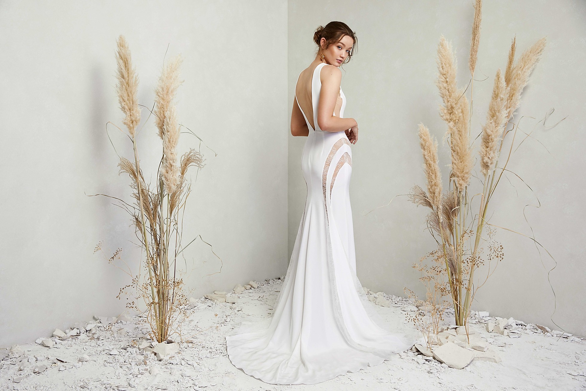 Silk Crepe Gown, with an open back and sides, and lace cutouts along the hips.
