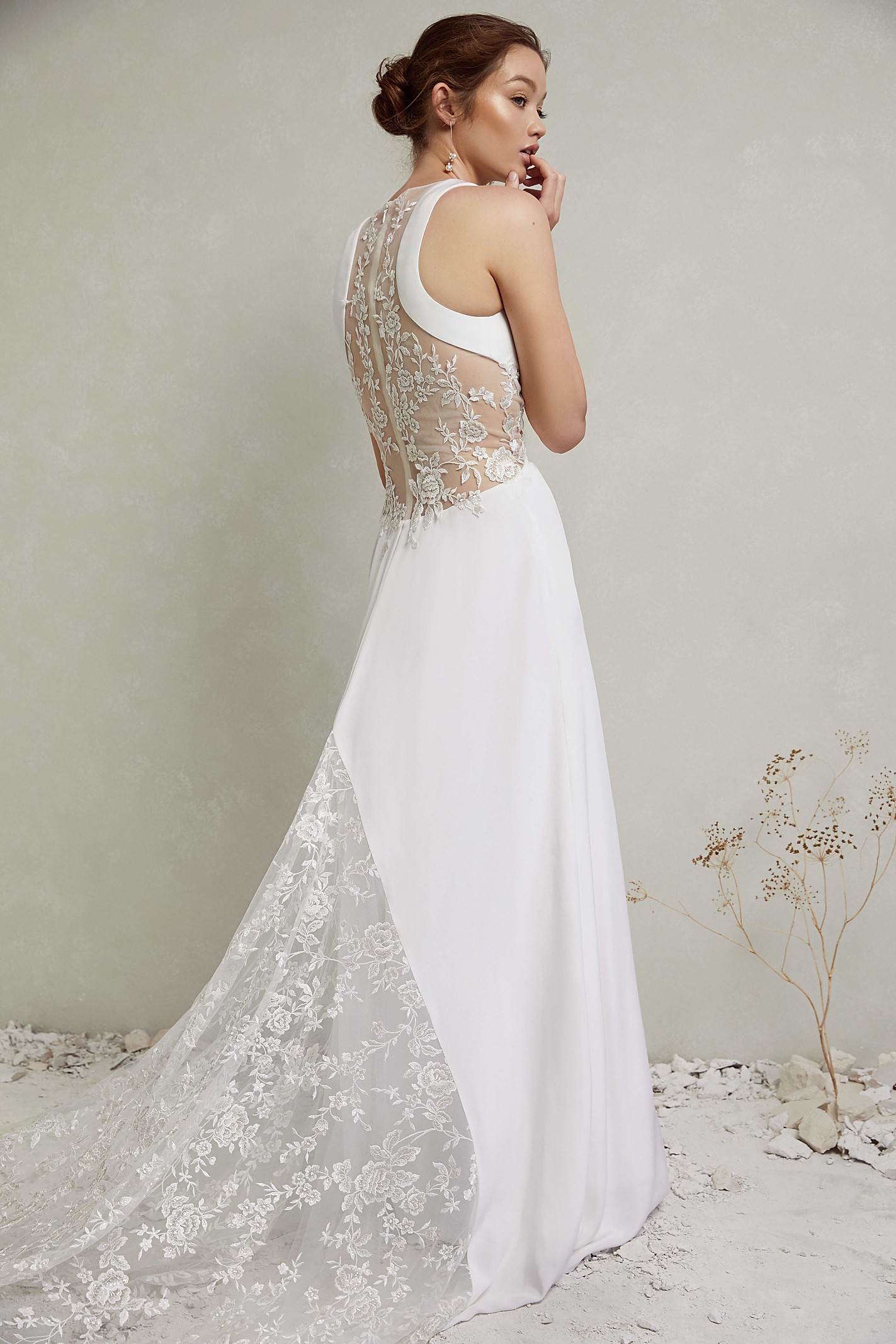 Silk Crepe gown with hand embroidered lace on the back, and a lace train in the skirt. Available with buttons along the back.