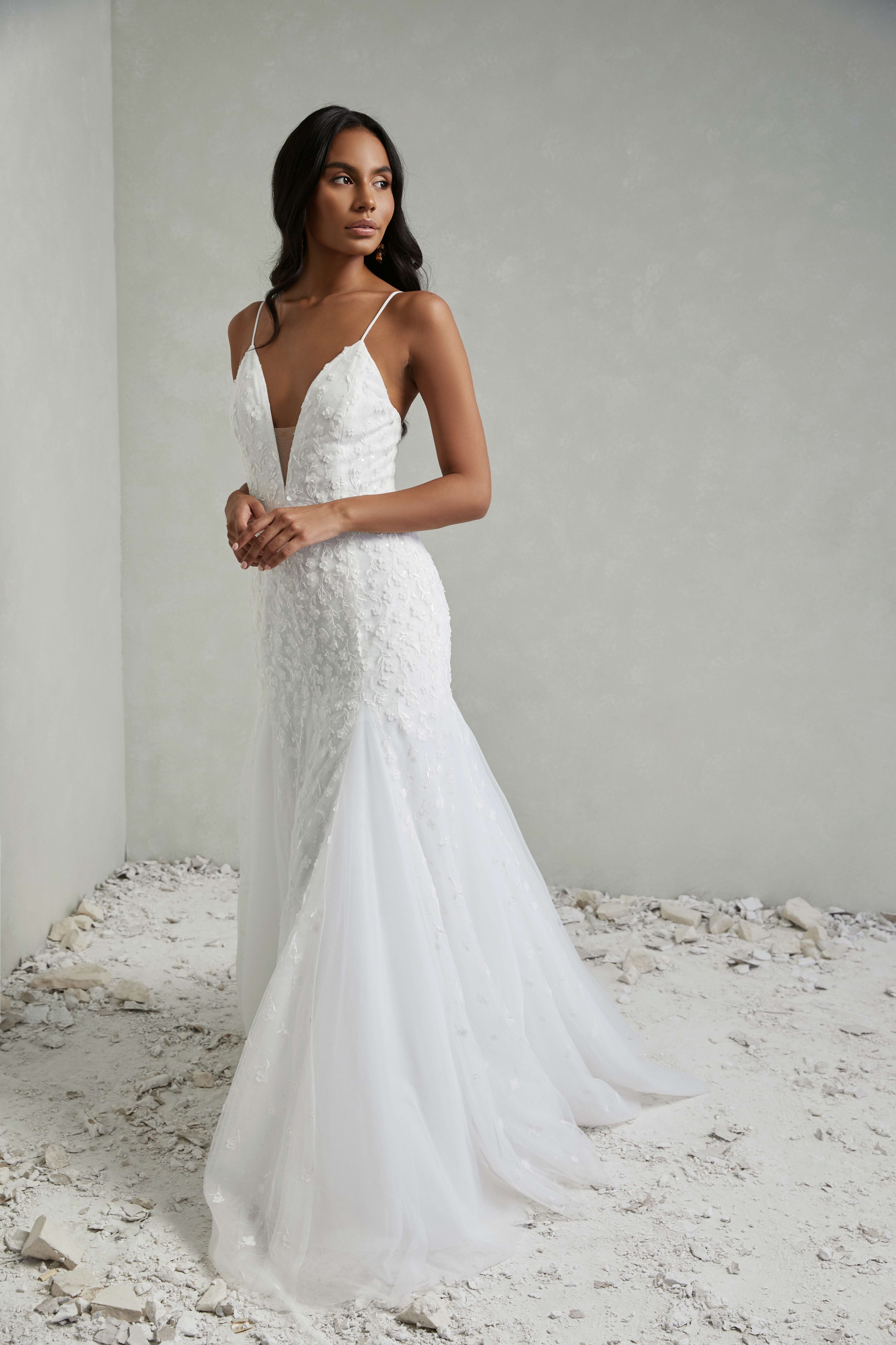 3D Floral lace with sequins, finished with soft tulle godets in the skirt and lined in silk.