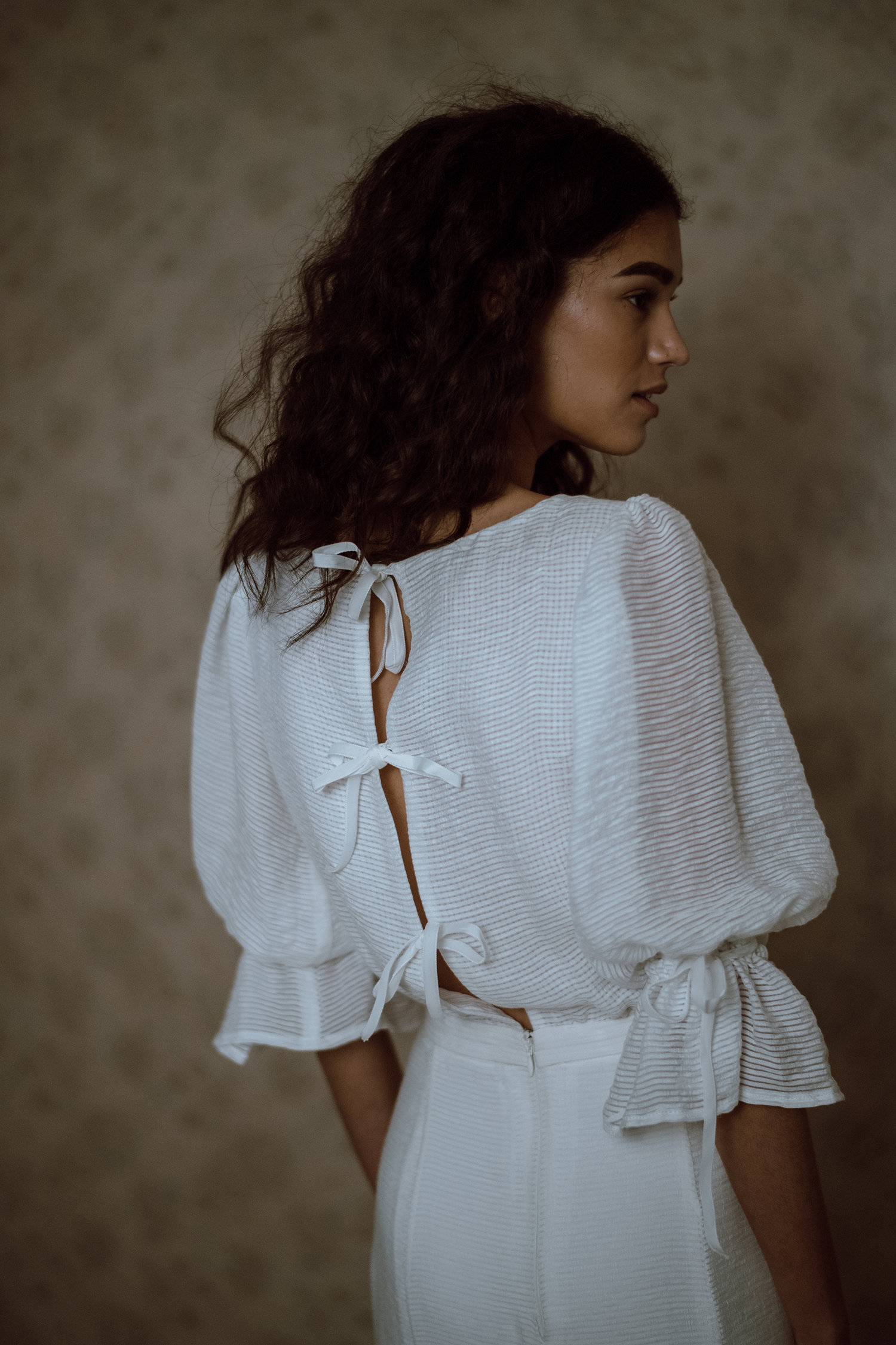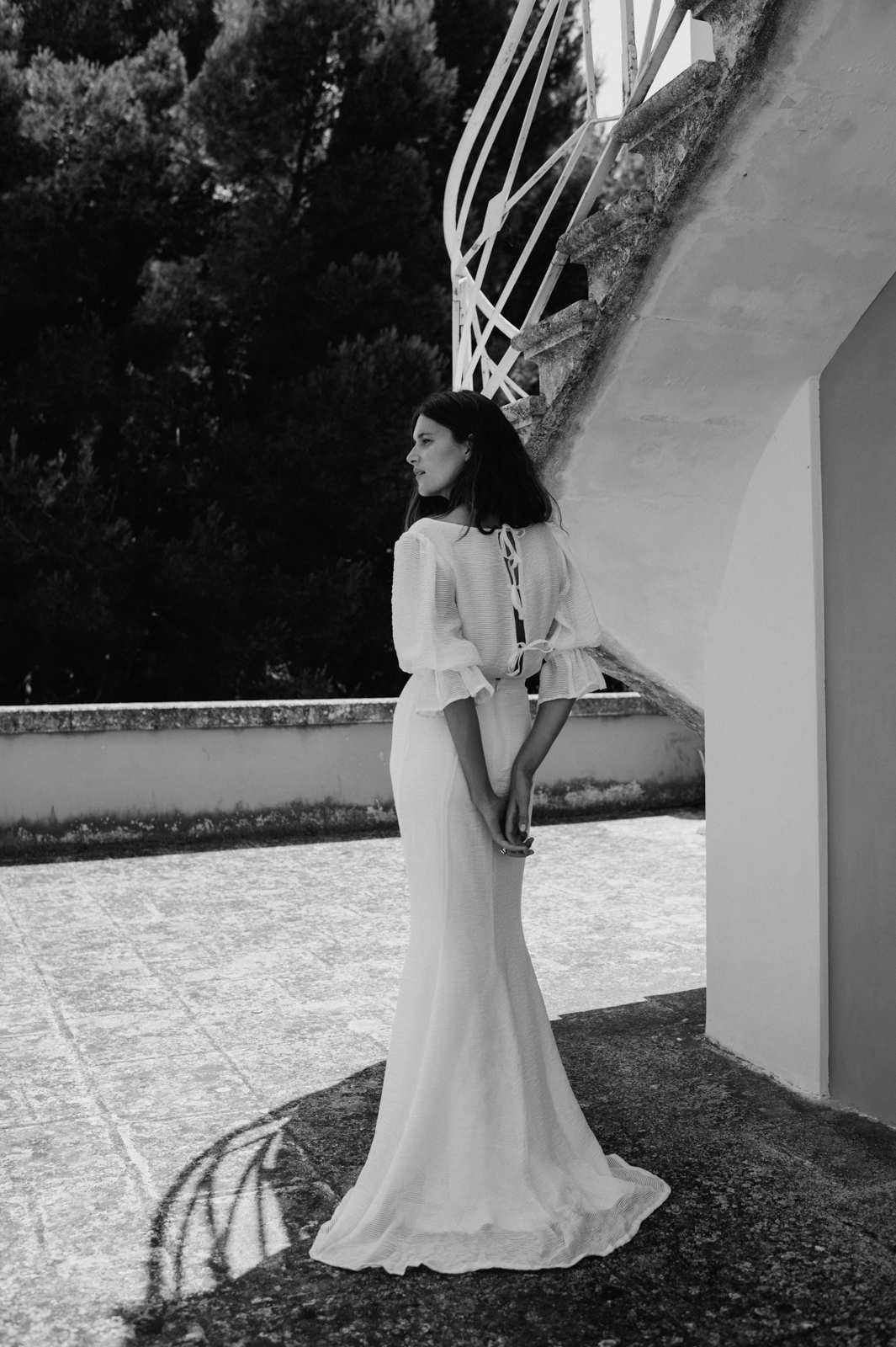 The Lotta Gown is a delicate and romantic garment made from a unique striped chiffon. A fitted silhouette in the skirt with a blousing feminine top, finished with dreamy velvet bows.