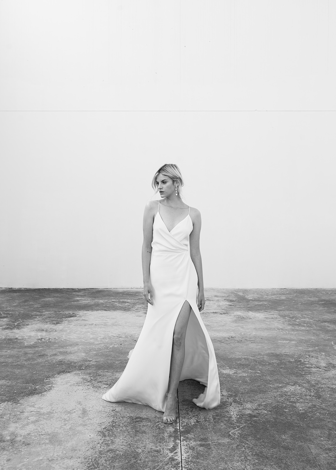 The Arlia gown is the sister gown of our beloved Arielle gown. With spaghetti straps and a soft drape cross over front bodice paired with a draped skirt and side split, inspired by our Couture bride Ghoncheh’s wedding dress.