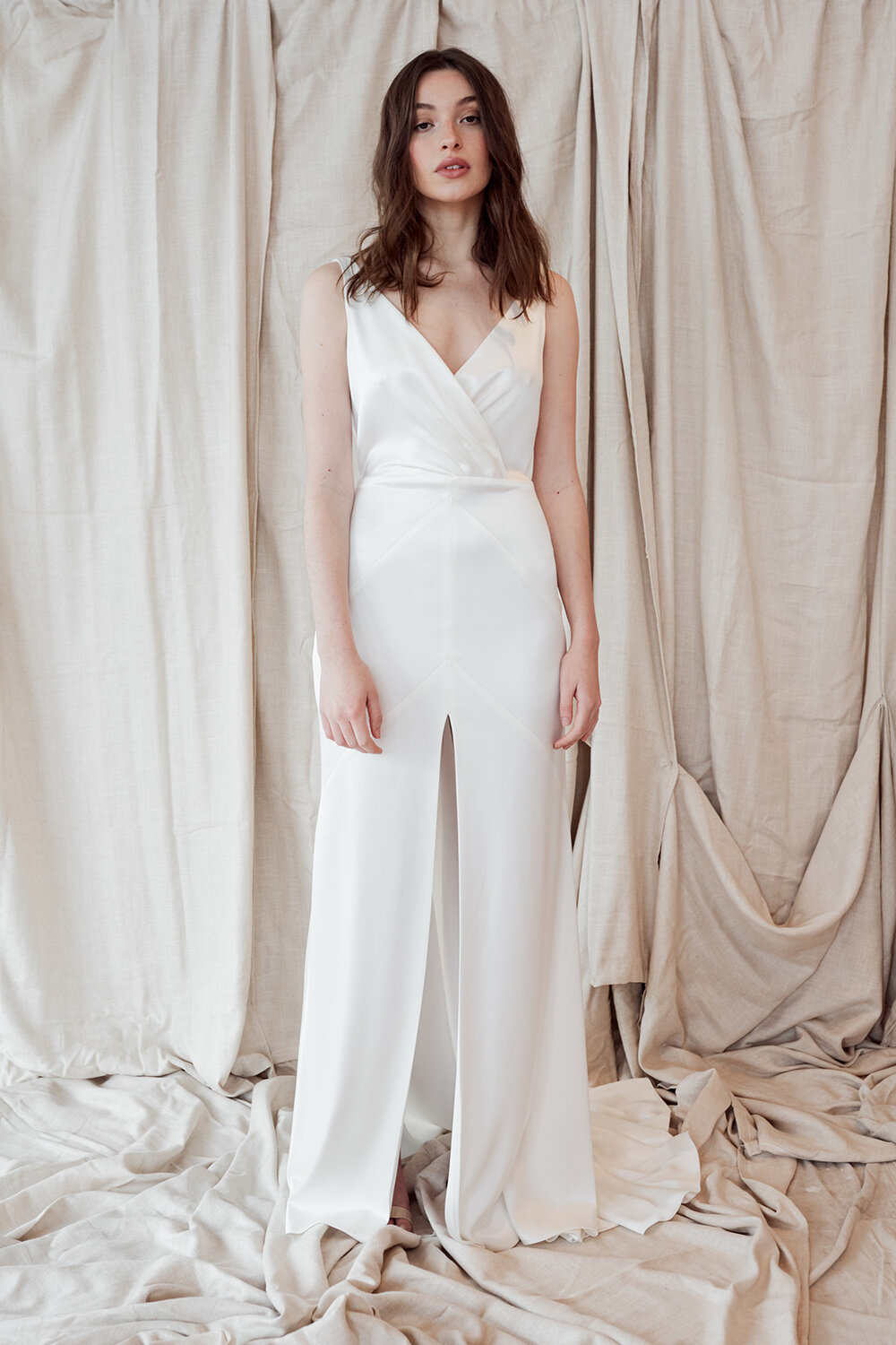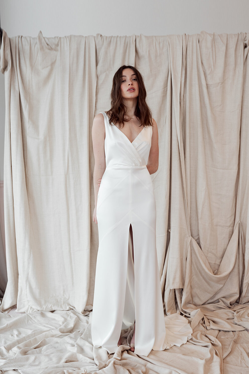 The Laura gown, named after one of our beautiful PJB real brides, is a combination of our Genevieve and Asta gowns. Laura came to us in love with a few styles and after trying them on, she loved the top of Arielle and the skirt of Genevieve in the Asta fabric. Although Laura’s bodice was modified to be more plunging at the front and sides, this combination reflects the overall look that she was going for with a more modest neckline.