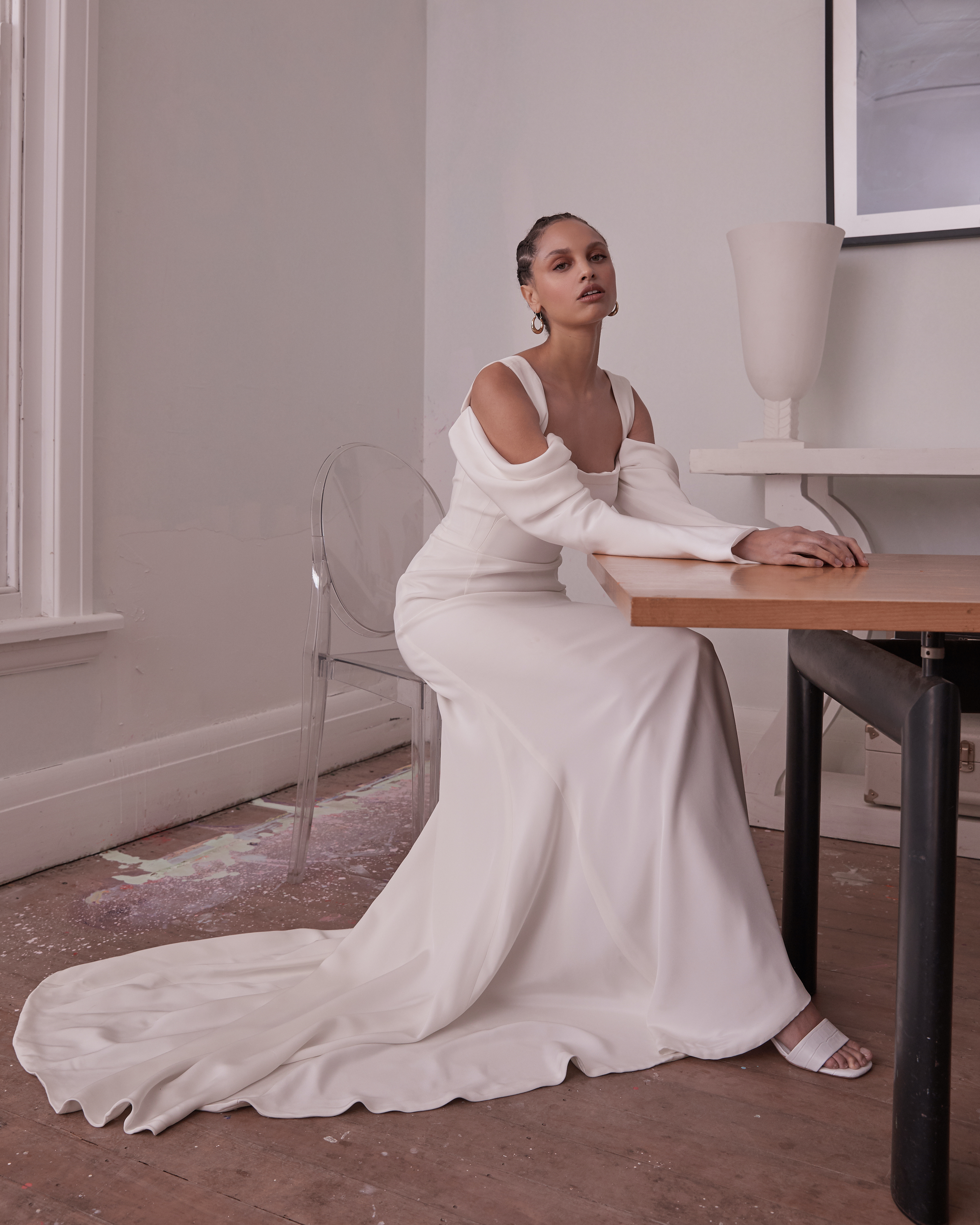 The panelling on the bodice of the Celine was inspired by the construction in vintage corsetry. She has a very clean minimal look from the front with the fit being taken from the sides. Style Celine with our Ana Detachable Sleeve to add a more fashion forward look to this classic and minimal gown.