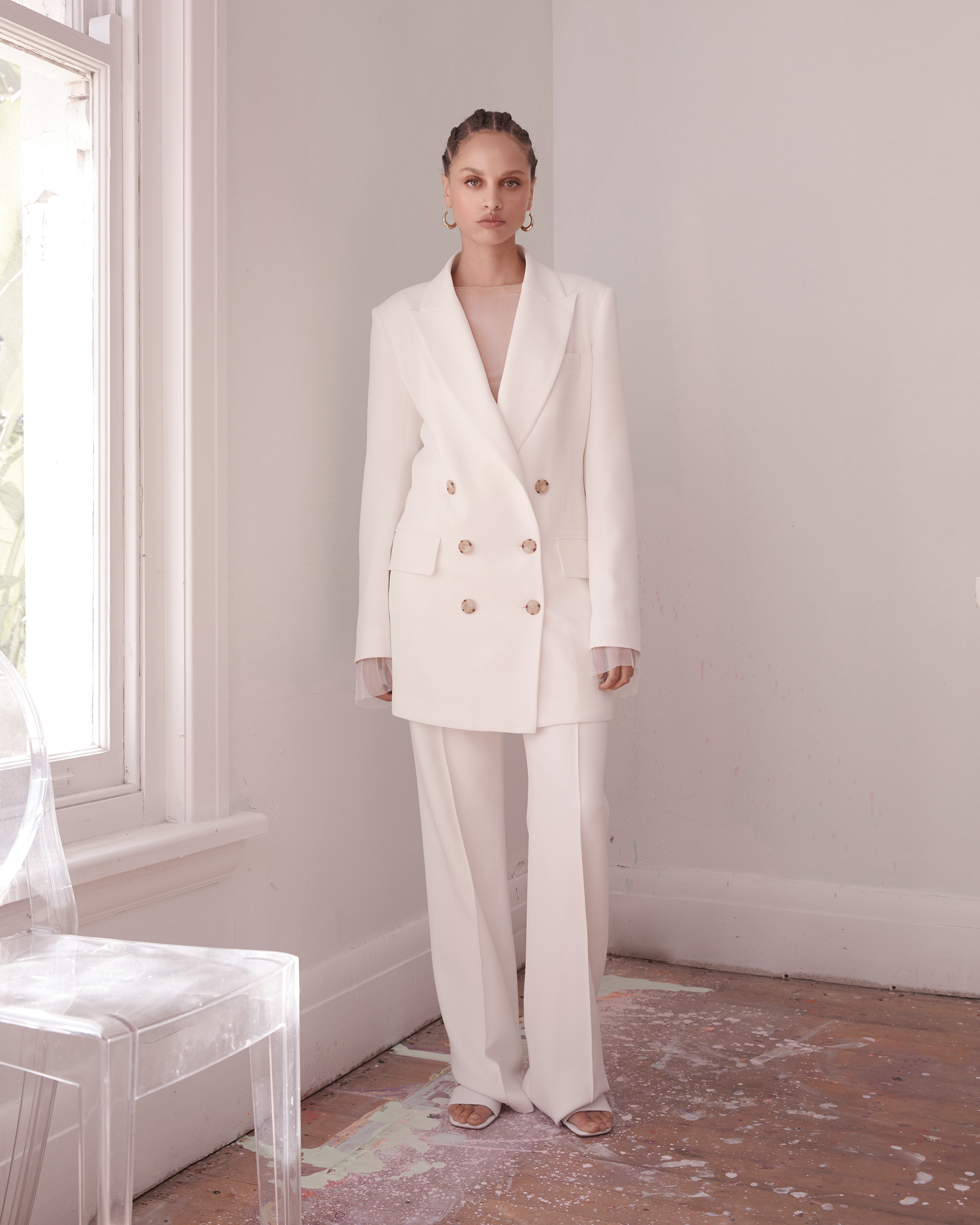 The Zoe Jacket is a tuxedo style double breasted blazer with clean lines and an incredible tailored fit. The Zoe Pant is a high-rise pant with a gentle flare in the hem and a pin stitched crease down the centre front and back leg.