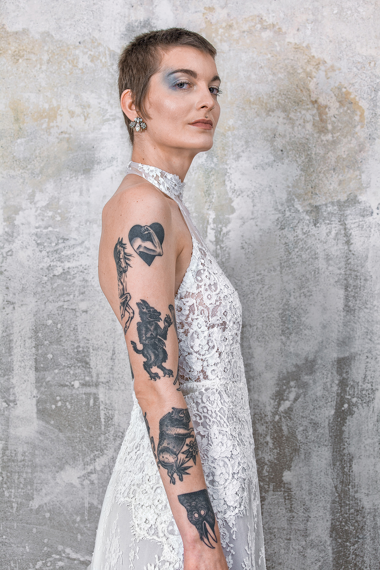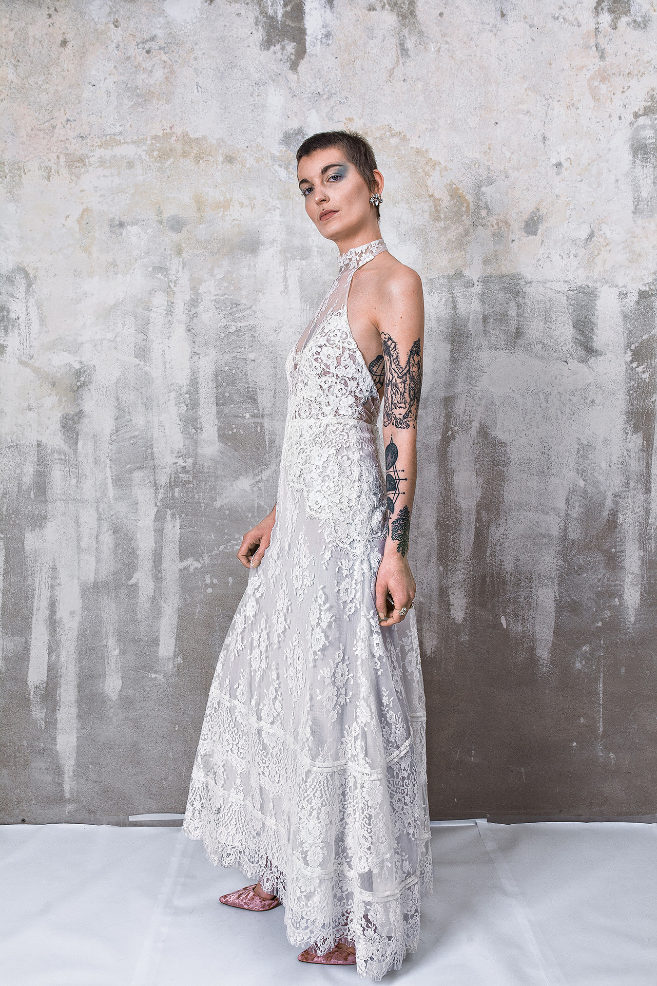 DRESS A-LINE LACE HALTER HIGH-NECK IVORY BOHO RELAXED