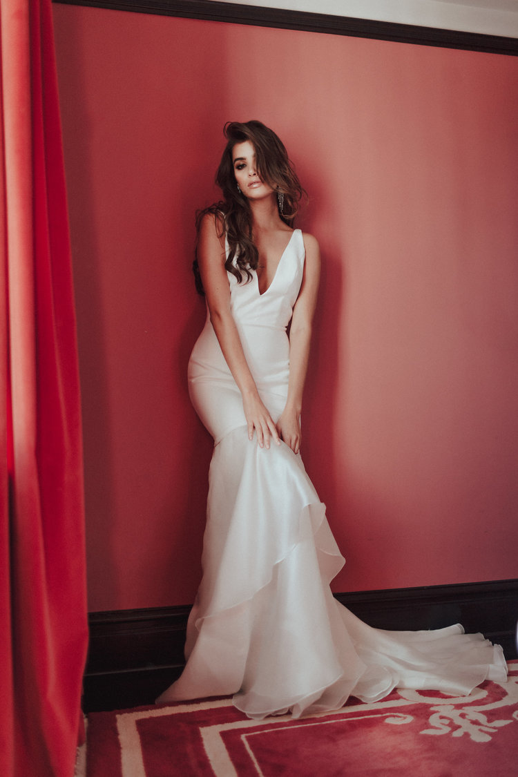 Whimsy meets sass for a quick drink at the oak room. Her crisp lines and plunging v details are lightened by the soft petal layers beginning at her knees and flowing into the softest of trains.