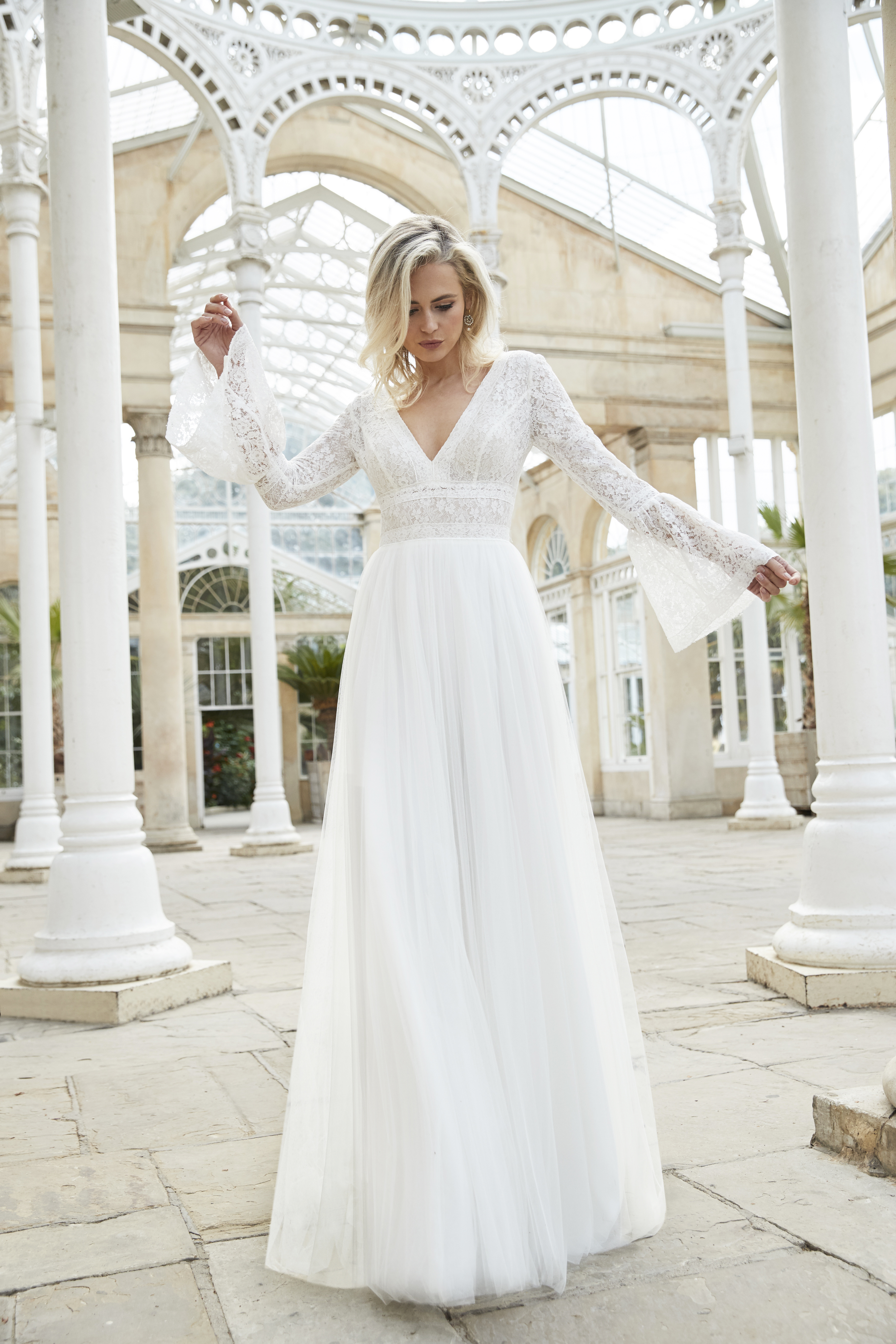 Constance, made entirely from English fabrics, has been designed to highlight the feminine silhouette beautifully. Expertly crafted from English Cluny lace, its romantic bodice and trumpet sleeves are the perfect balance. It also features a low-cut back that brings the dress to life from every angle. Live out your wildest dreams as you dance the night away while the English tulle skirt of this dress dances with you.