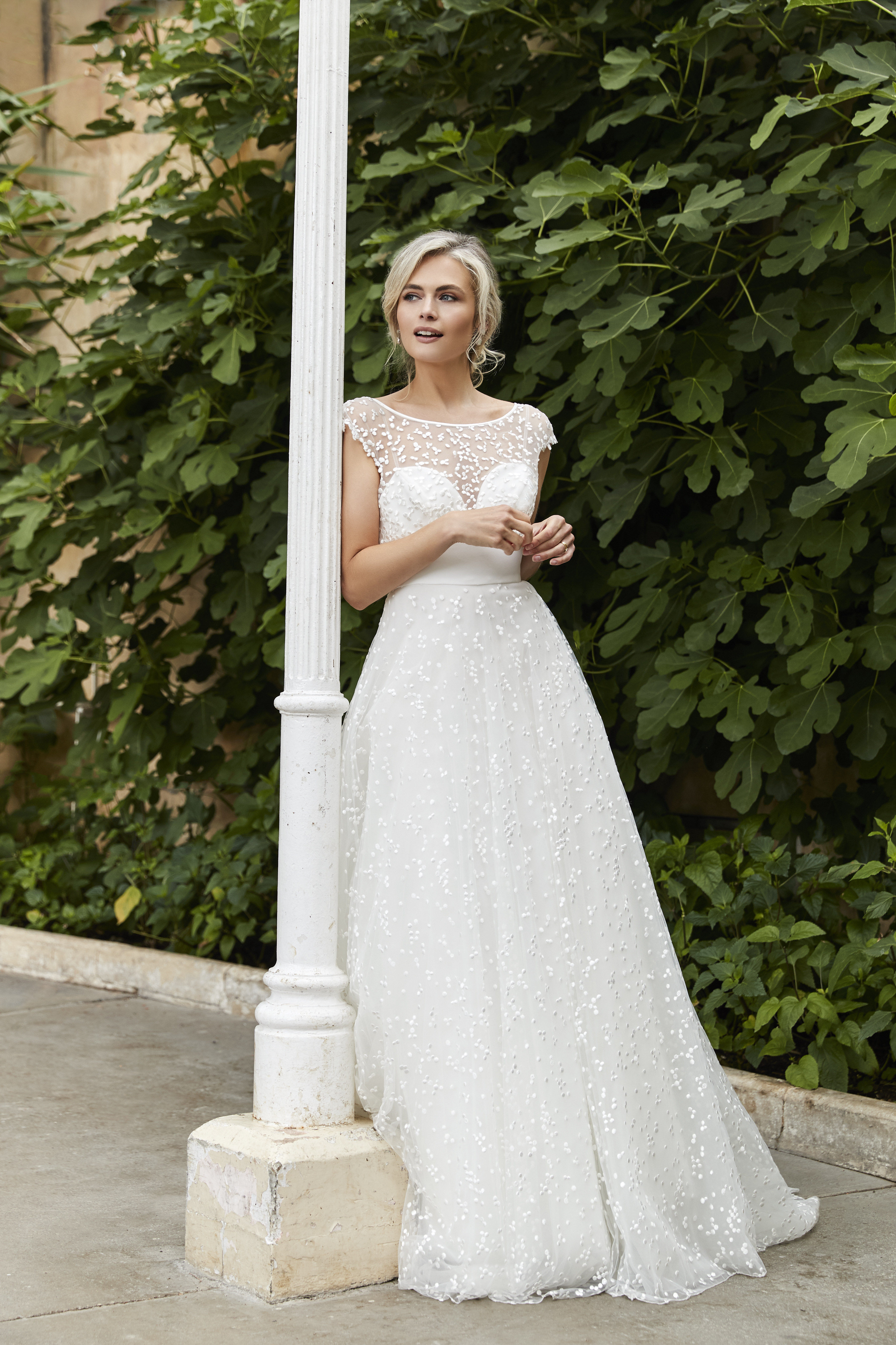Darling Dorothy is an alluring display of delicate details crafted from magical re-embroidered tulle. A glamourous ballgown with soft elements such as a wispy sheer bateau neckline and flattering cap sleeves. It also boasts a low-cut back that frames the body and flows into an elegant, full-bodied skirt. Dazzle your guests in this dreamy wedding dress that is sure to make a lasting impression.
