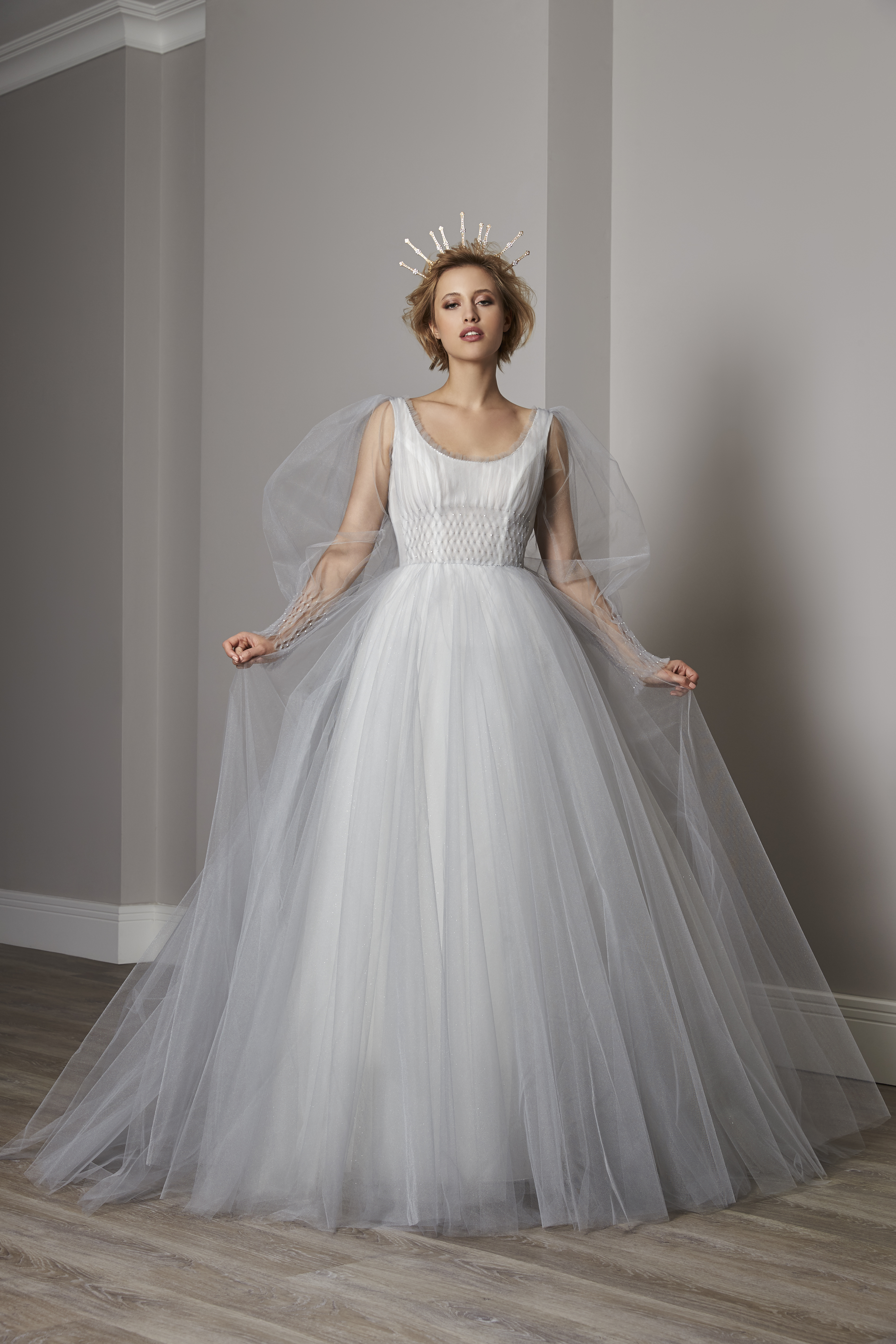 Platinum, ivory or blush tulle ball gown, featuring crystal hand smocking. Available with or without sleeves.