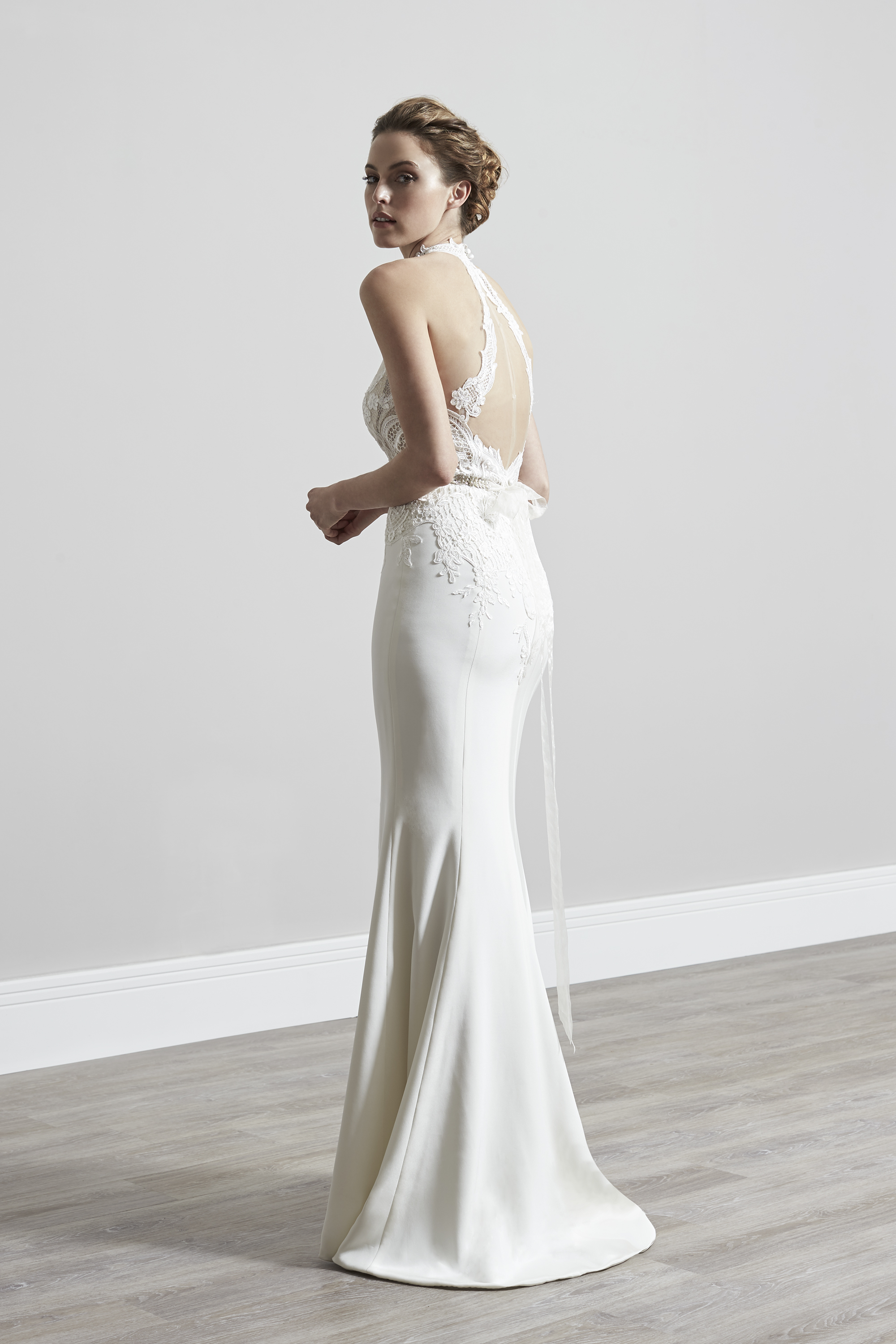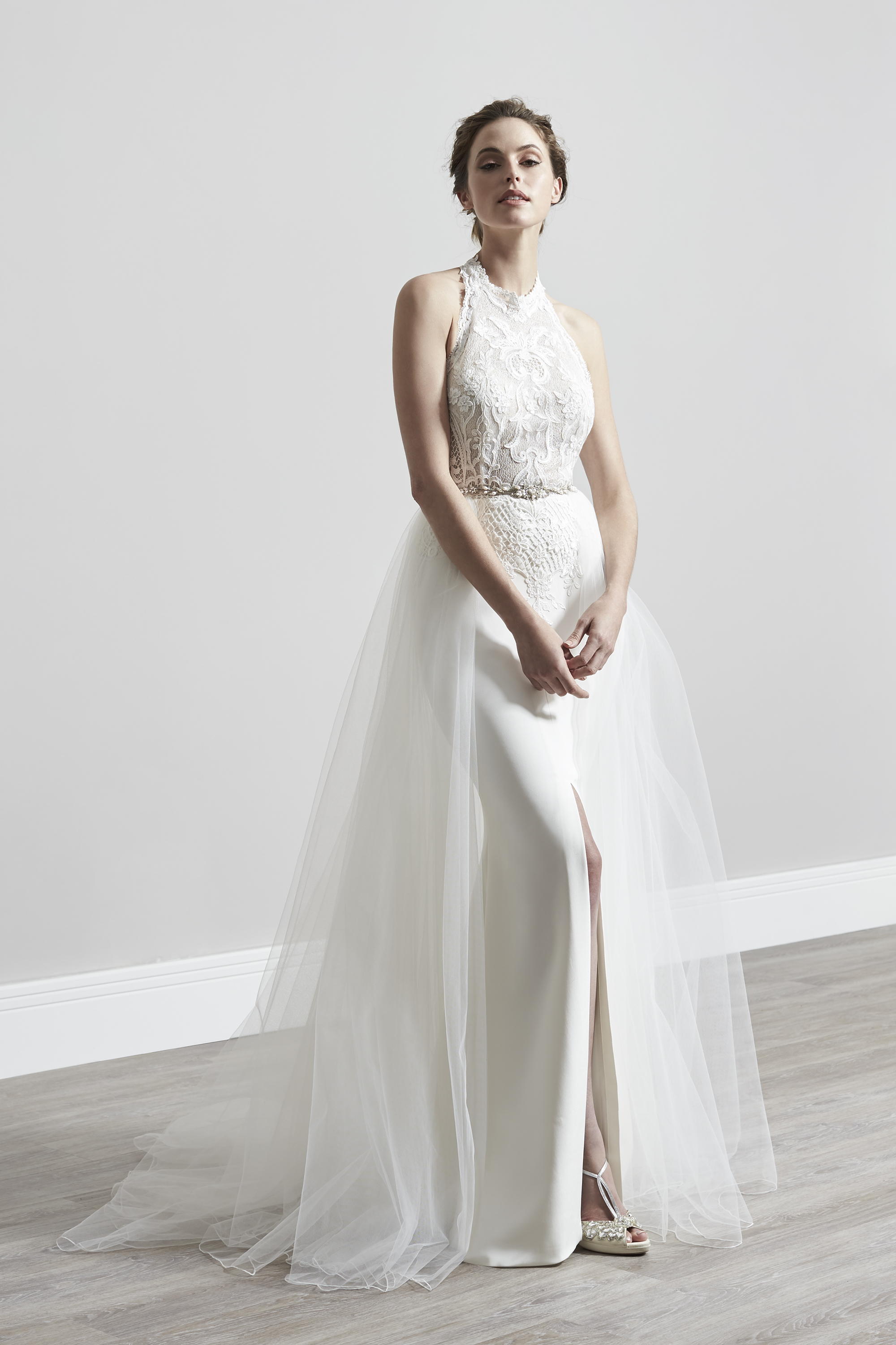 Shown styled with Josephine over skirt, Eva is a beautiful halterneck gown with deconstructed corded lace bodice with slim crepe skirt. The central split offers a additional detail and chance to show off those gorgeous wedding shoes.
