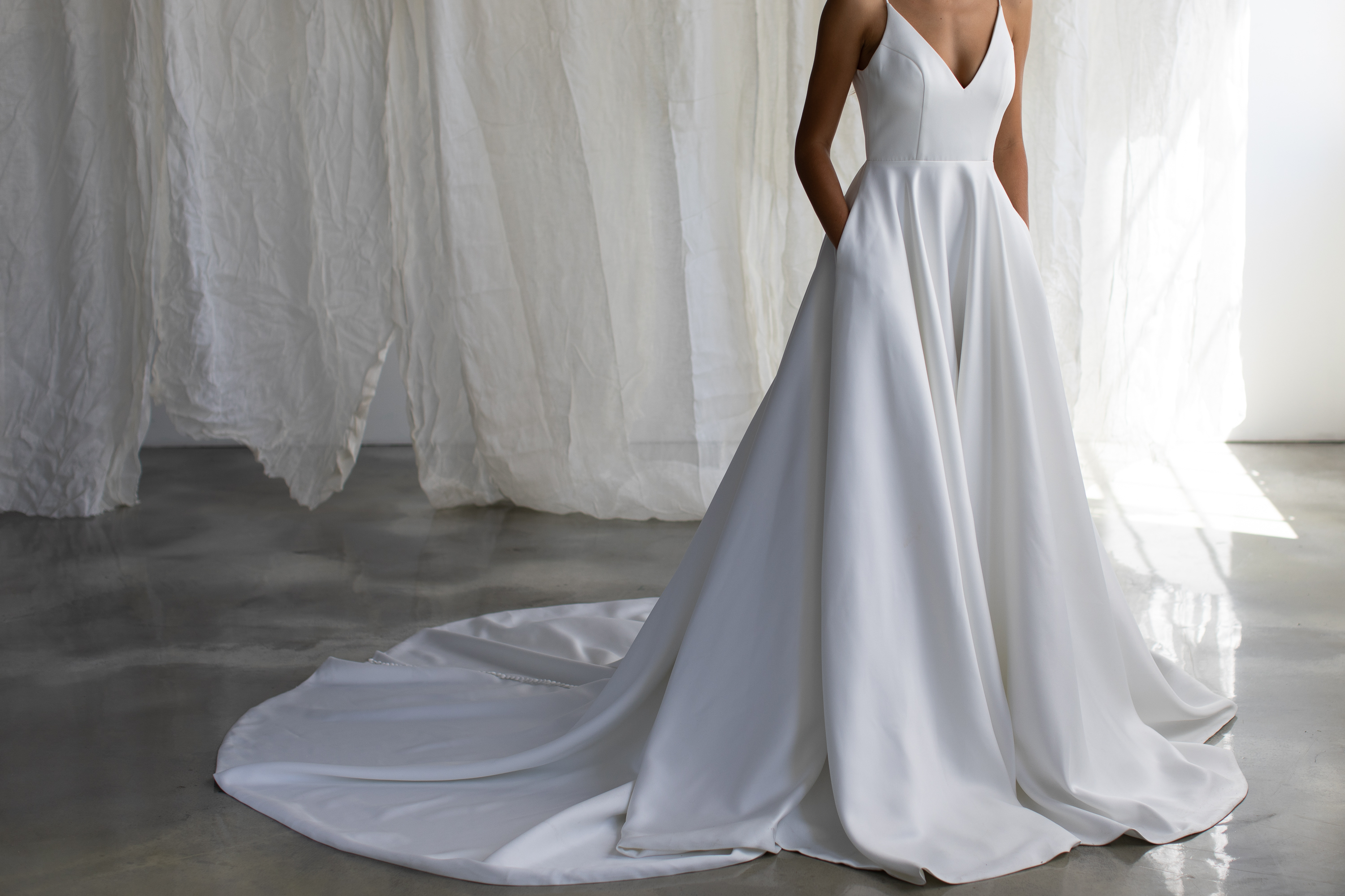 Contemporary ballgown made with luxurious velvet satin, featuring a low cut deep V back, buttons to the end of the train, complete with pockets.