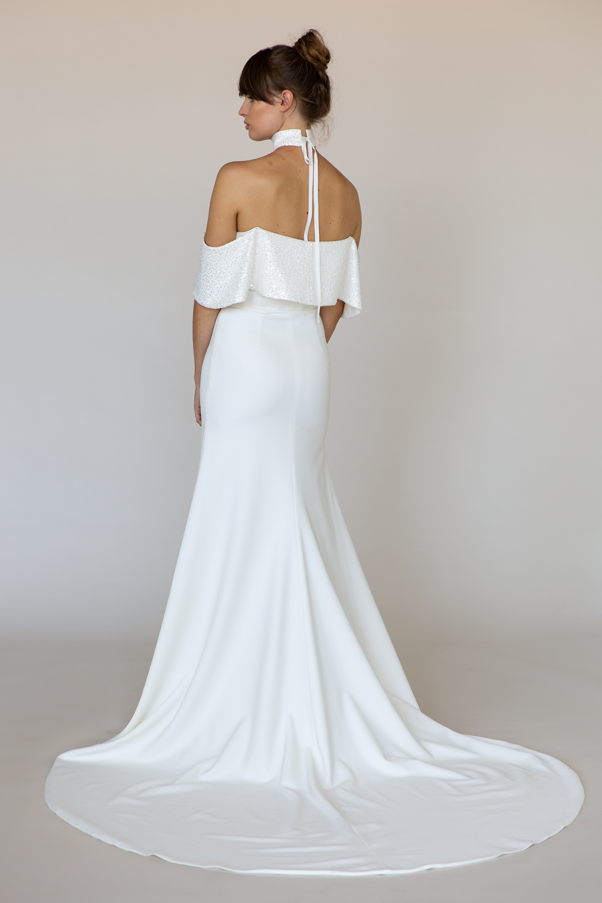 A spin off of our best selling Grace gown – Roxanne features a beaded off the shoulder droop panel, boned bodice, stretch crepe fit and flare skirt, asymmetrical slit (optional) complete with a matching beaded choker to add height.
