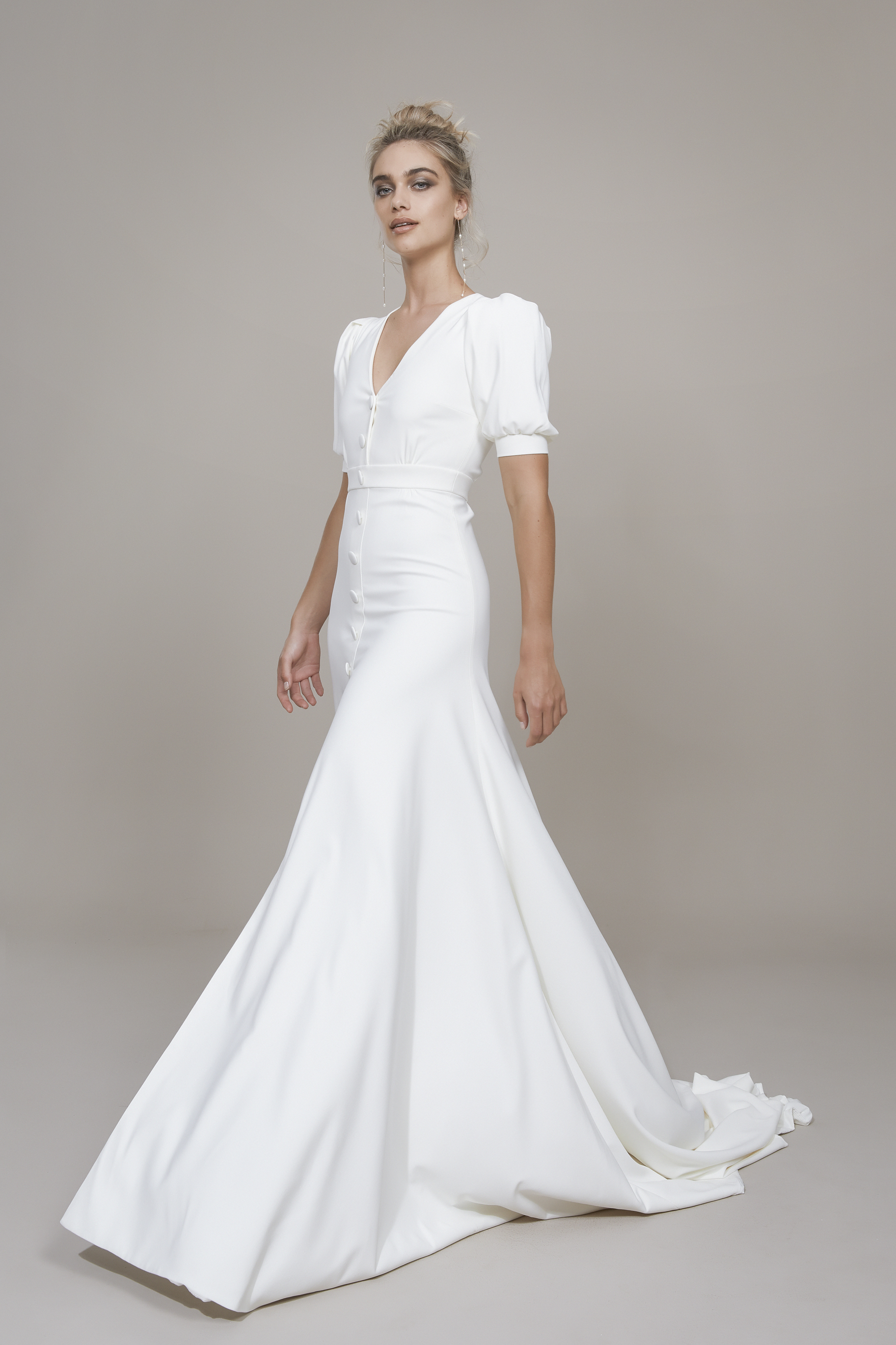 Soft stretch crepe fit and flare gown with an inched waistline to accentuate the female form, puff sleeve and button detail. Optional lower slit and full length buttons. Not subject to mix & match.