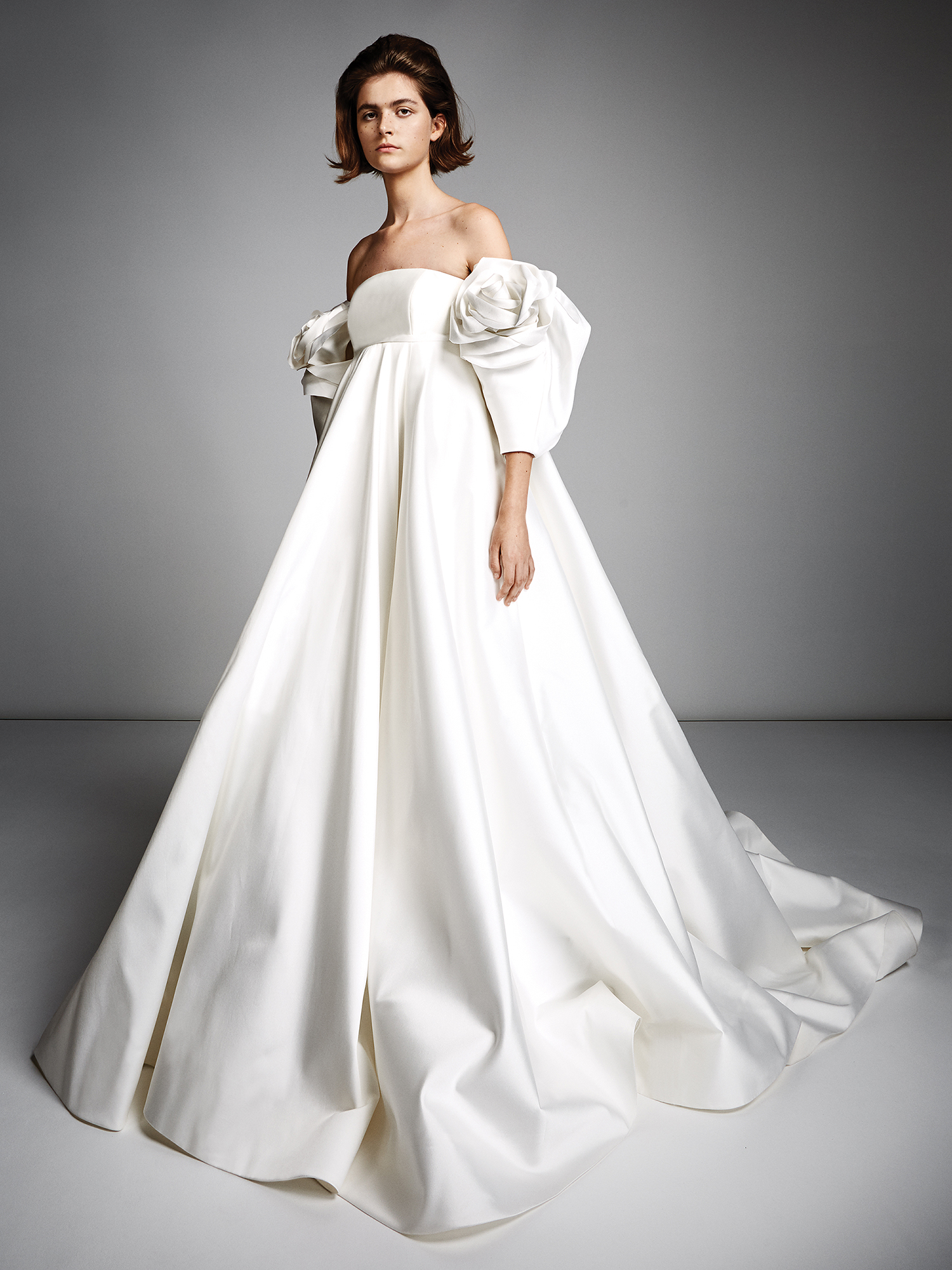 Dramatic, off-the-shoulder gown with a luxurious and voluminous silk blend skirt. This gown features an intricately draped rose which transforms into a puff sleeve. The voluminous watteau train highlights the extravagance of the gown.